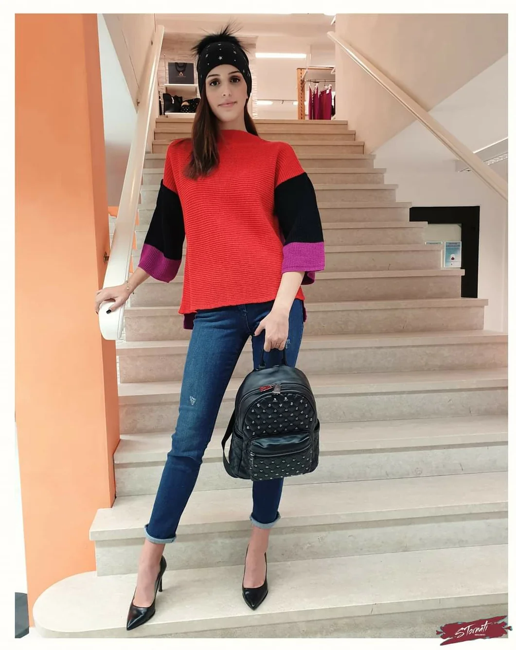 Maglione color block corallo, ciclamino, nero. Scollo a barchetta leggermente alto con lavorazione costine orizzontali e maniche 3/4 ampie.