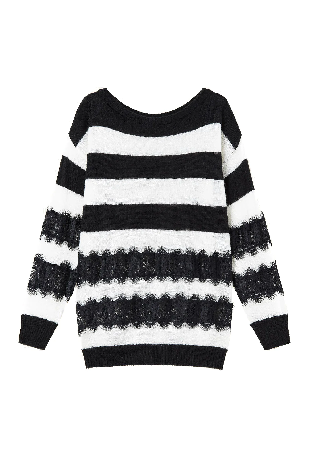 Maxi maglia a righe con inserti in pizzo in trasparenza, scollo a barchetta, maniche lunghe, linea morbida.