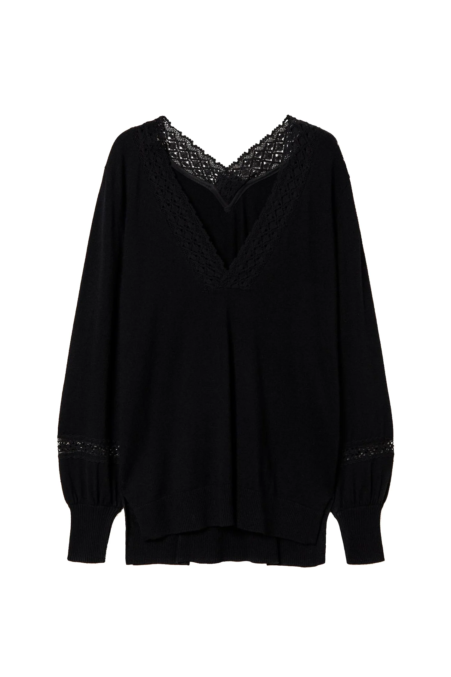 Maxi maglia in misto viscosa con inserti in pizzo di cotone, scollo a V, spalle leggermente scese, linea morbida.