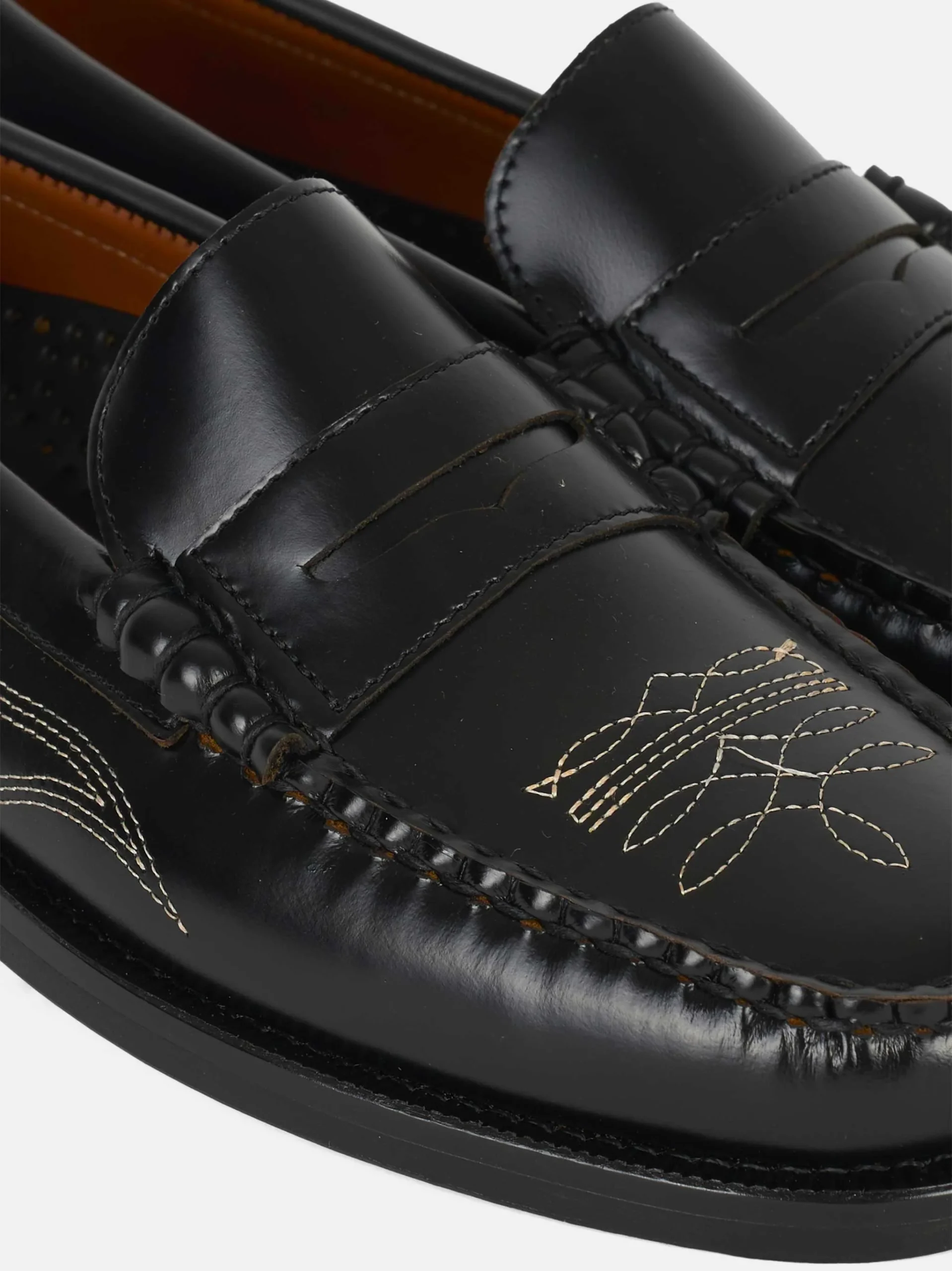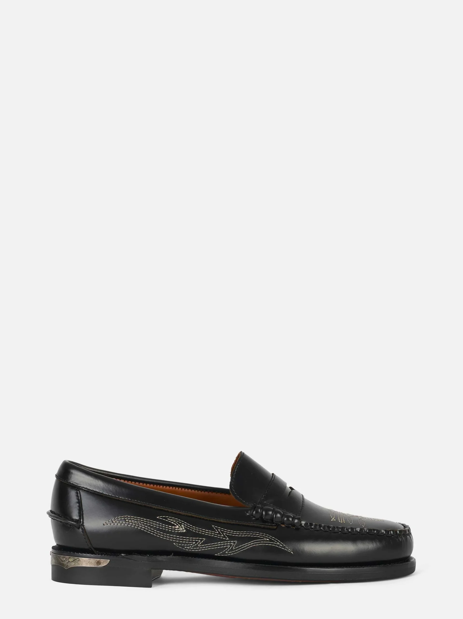 ITEM INFO Mocassino Dan Dallas in pelle nera Ricamo laterale con motivo grafico a contrasto Mascherina penny loafer con cuciture a moc toe Fodera in pelle naturale Suola in cuoio sottile con inserto metallico sul tacco Composizione: 100% Pelle