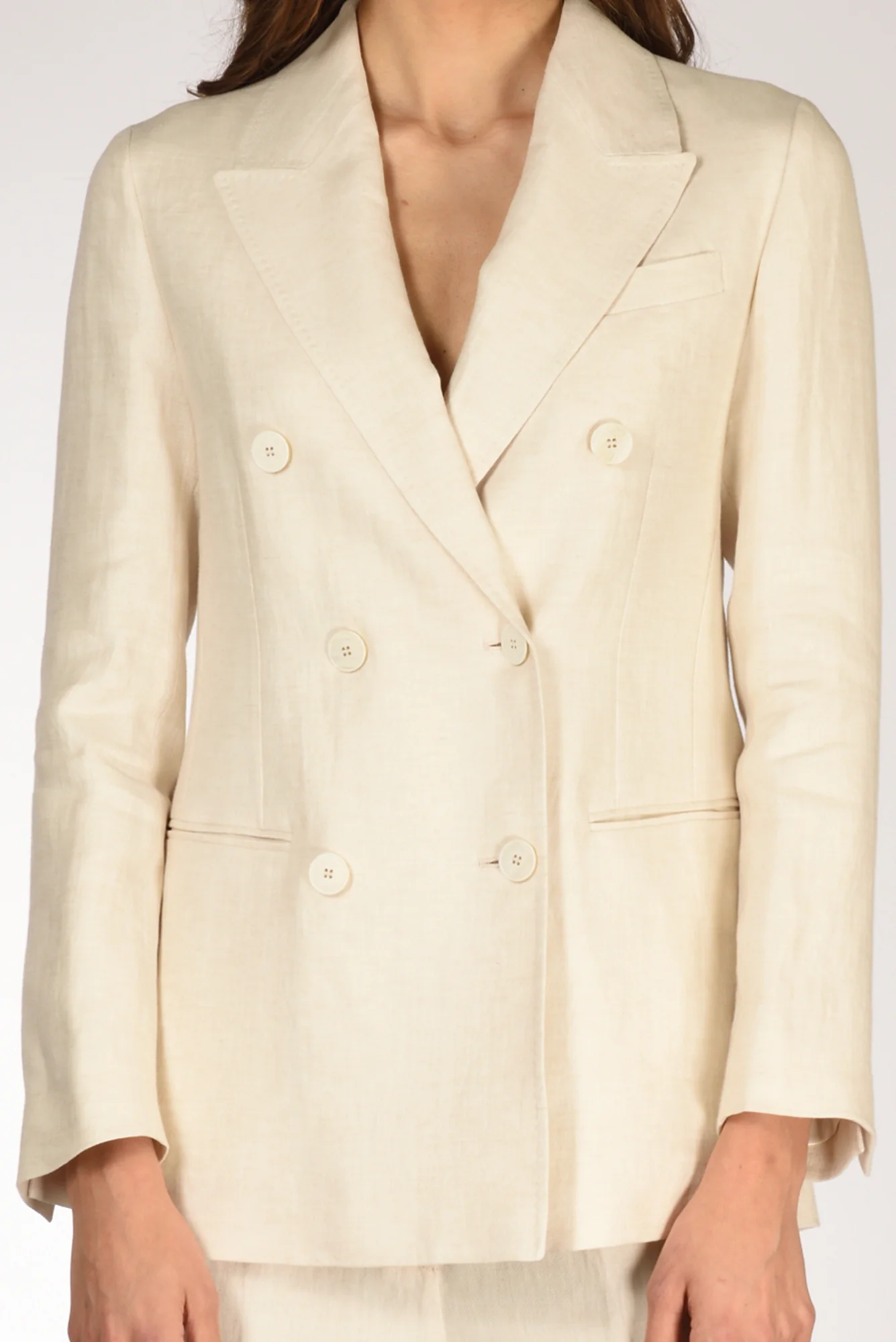 Giacca Doppio Petto, Collo A Revers, Tasche Frontali A Filetto, Spacco Posteriore Centrale, Manica Tre Bottoni, Vestibilita’ Ampia, Composizione 100 Lino, Made In Italy