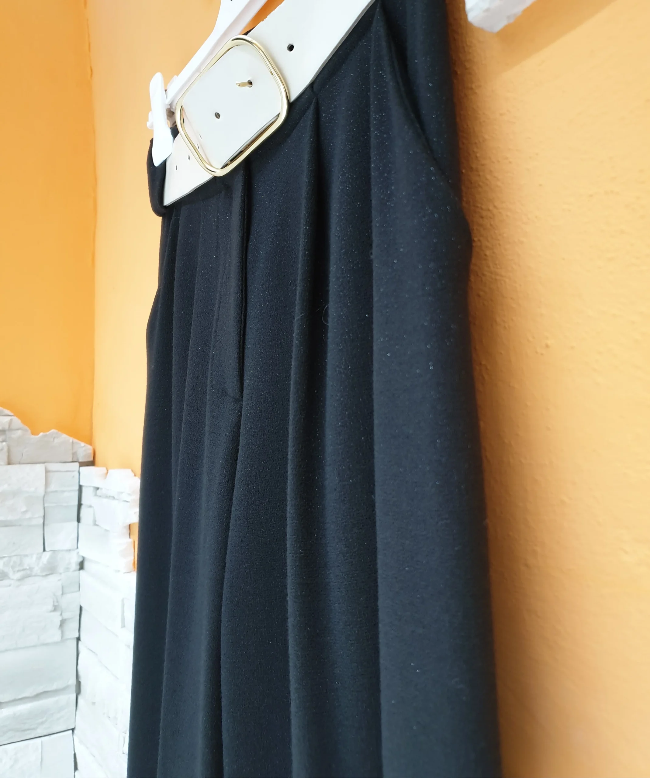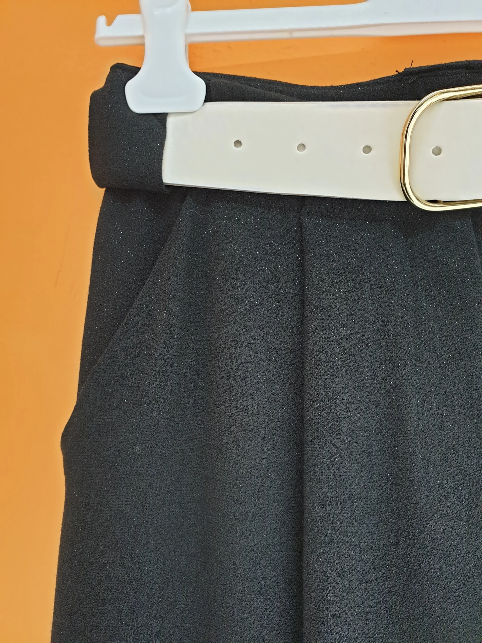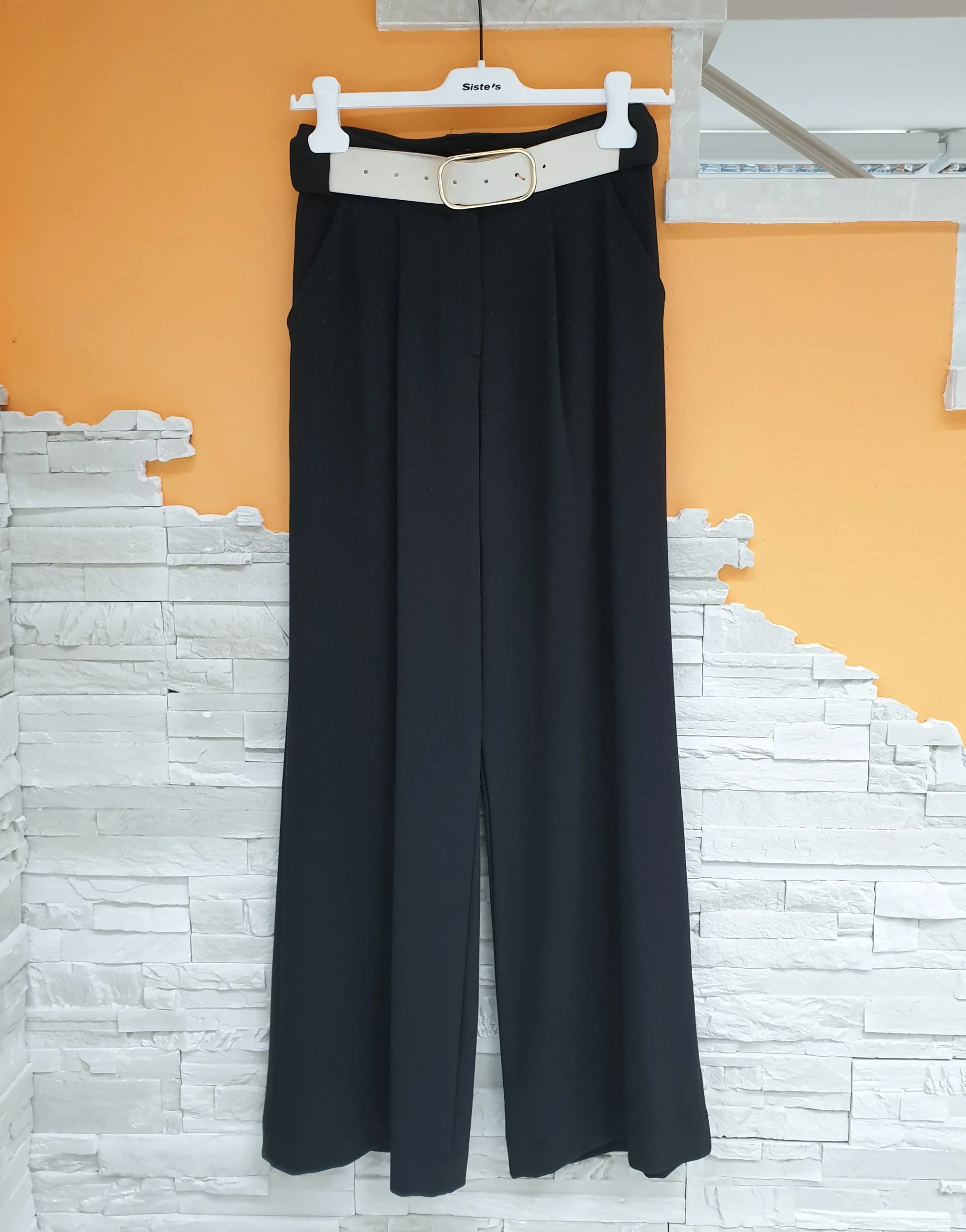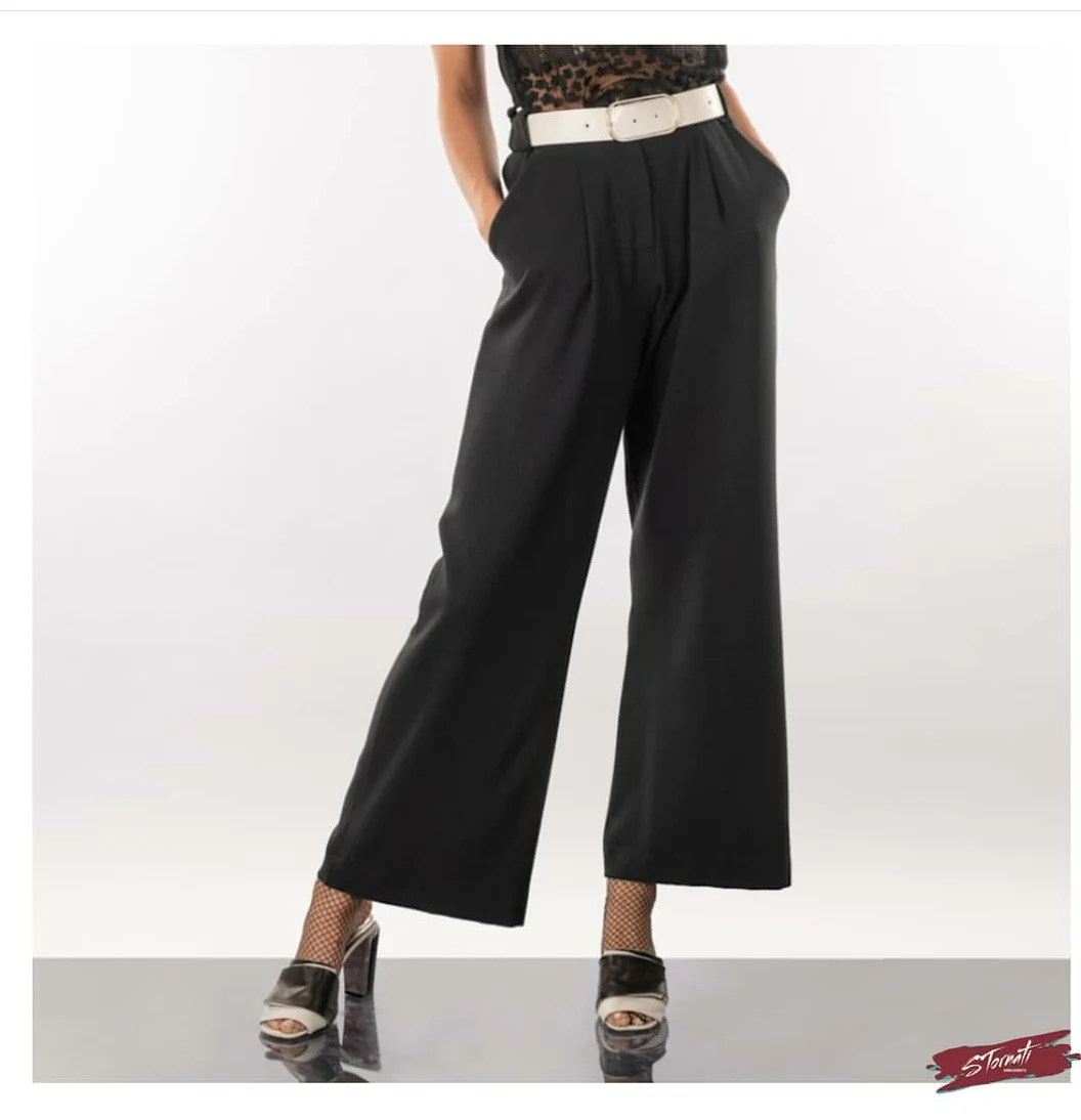 Pantalone ampio in maglia leggermente glitterata. Pantalone con pinces frontali e tasca uomo, con passanti e cintura in abbinato. Vestibilità scivolata, super elasticizzato e confortevole.