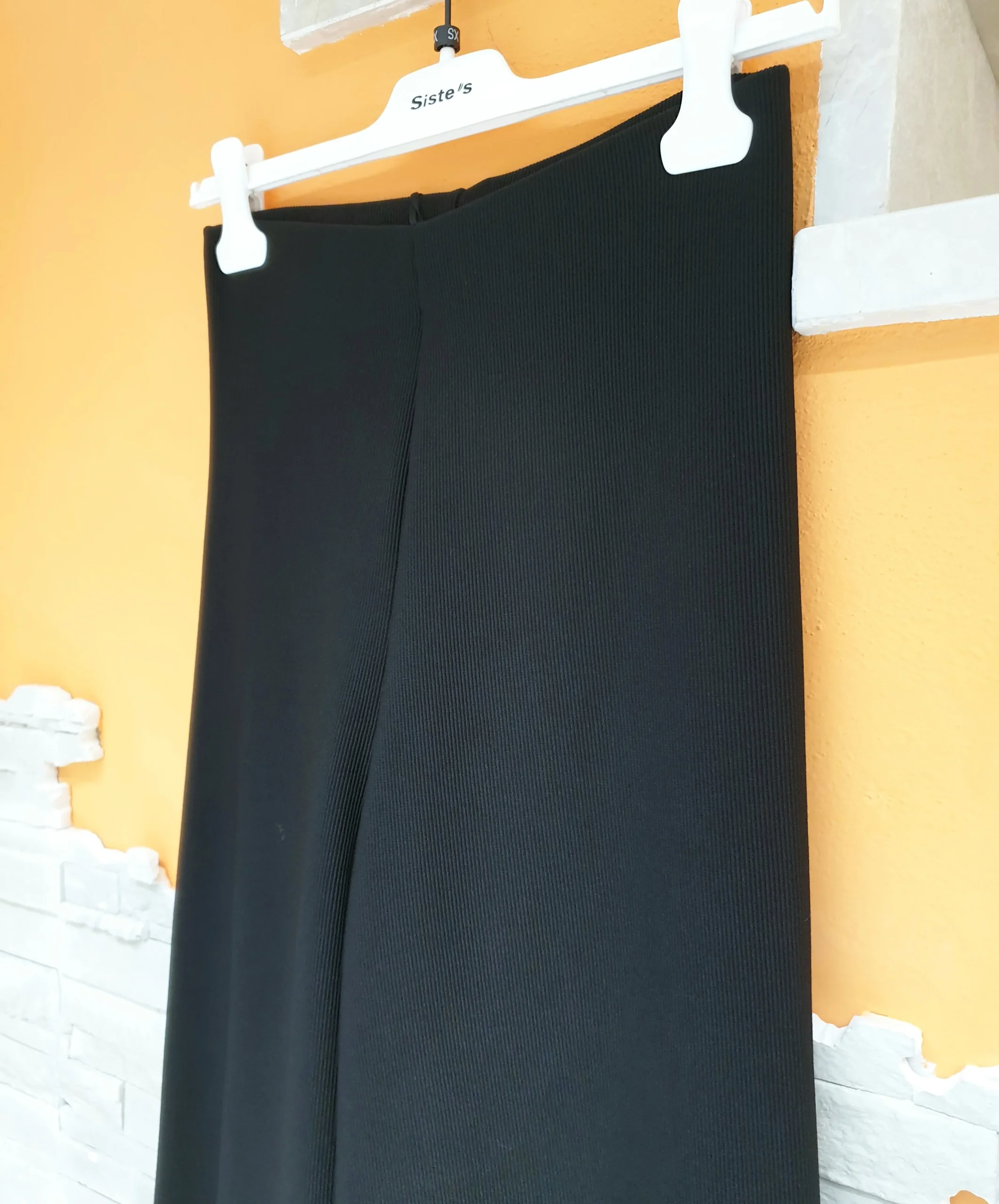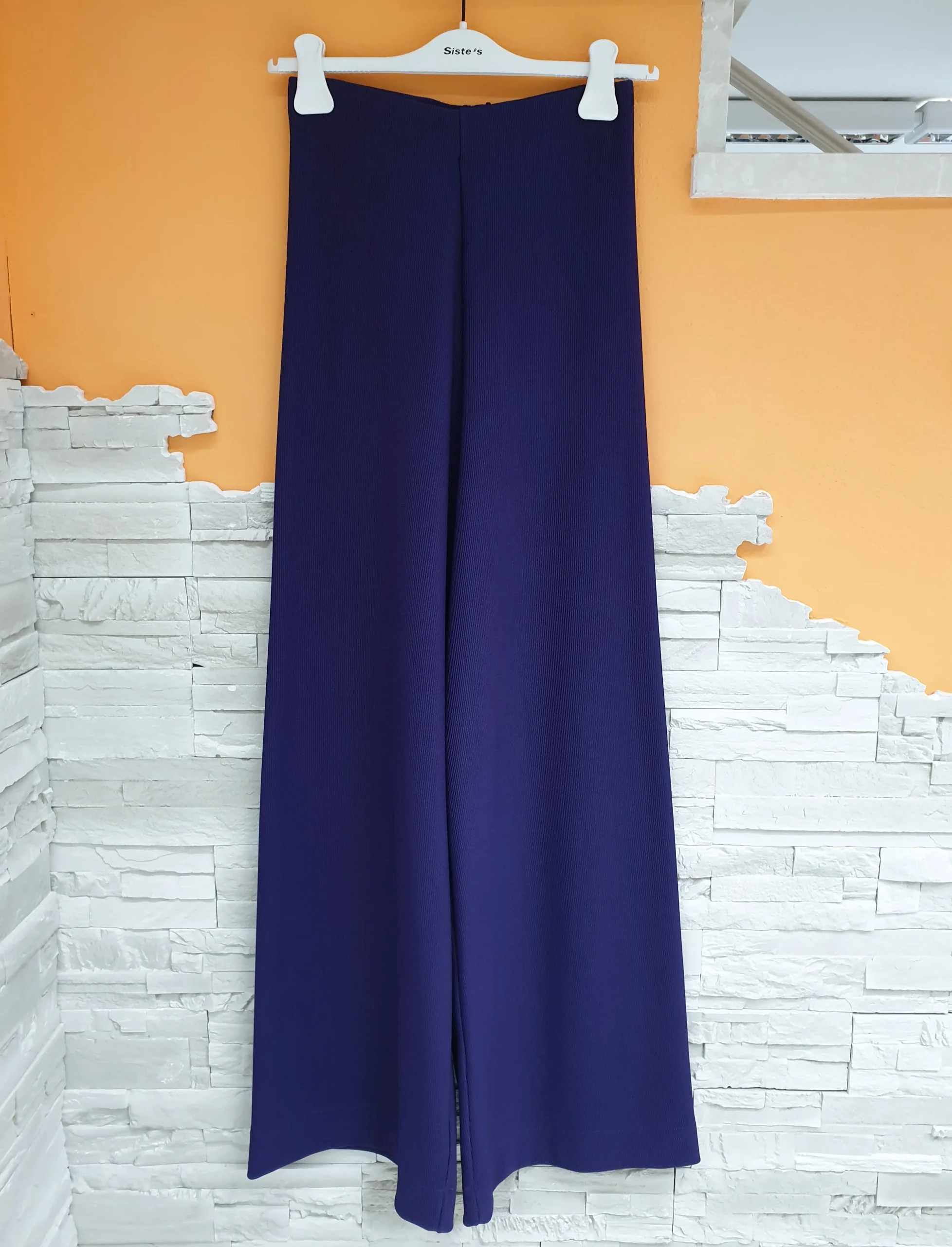 Pantalone palazzo con elastico vita, senza zip o bottoni. Tessuto simil maglia molto comodo ed elastico con micro costine, vita alta.