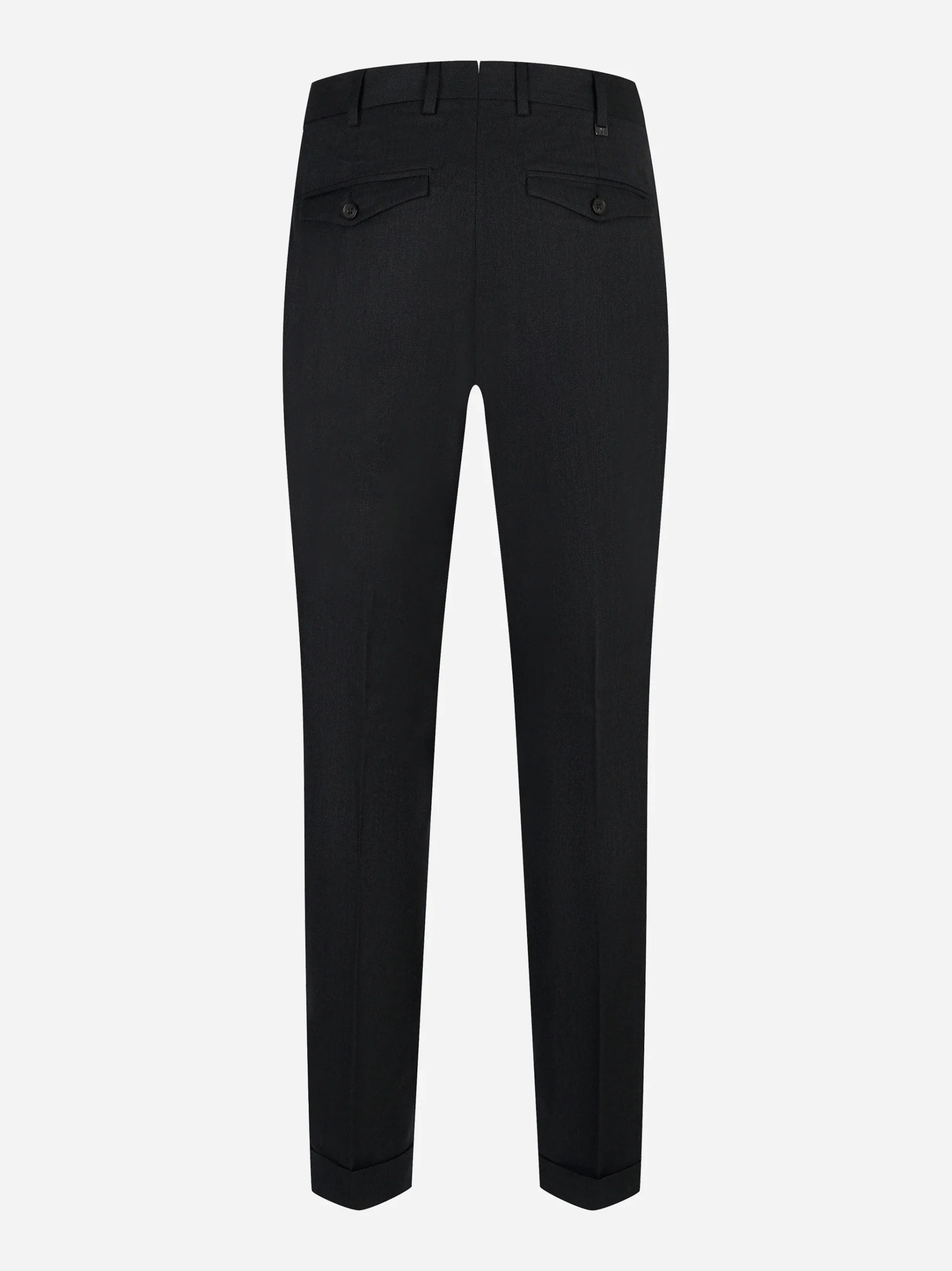 ITEM INFO Pantalone carrot fit in lana stretch blu notte Linea Rebel con piega stirata e costruzione sartoriale Chiusura frontale con zip e gancio a scomparsa Due tasche laterali a filo Due tasche posteriori con pattina e bottone Fondo con risvolto cucito Composizione: 99% Lana Vergine, 1% Elastan Made in Italy
