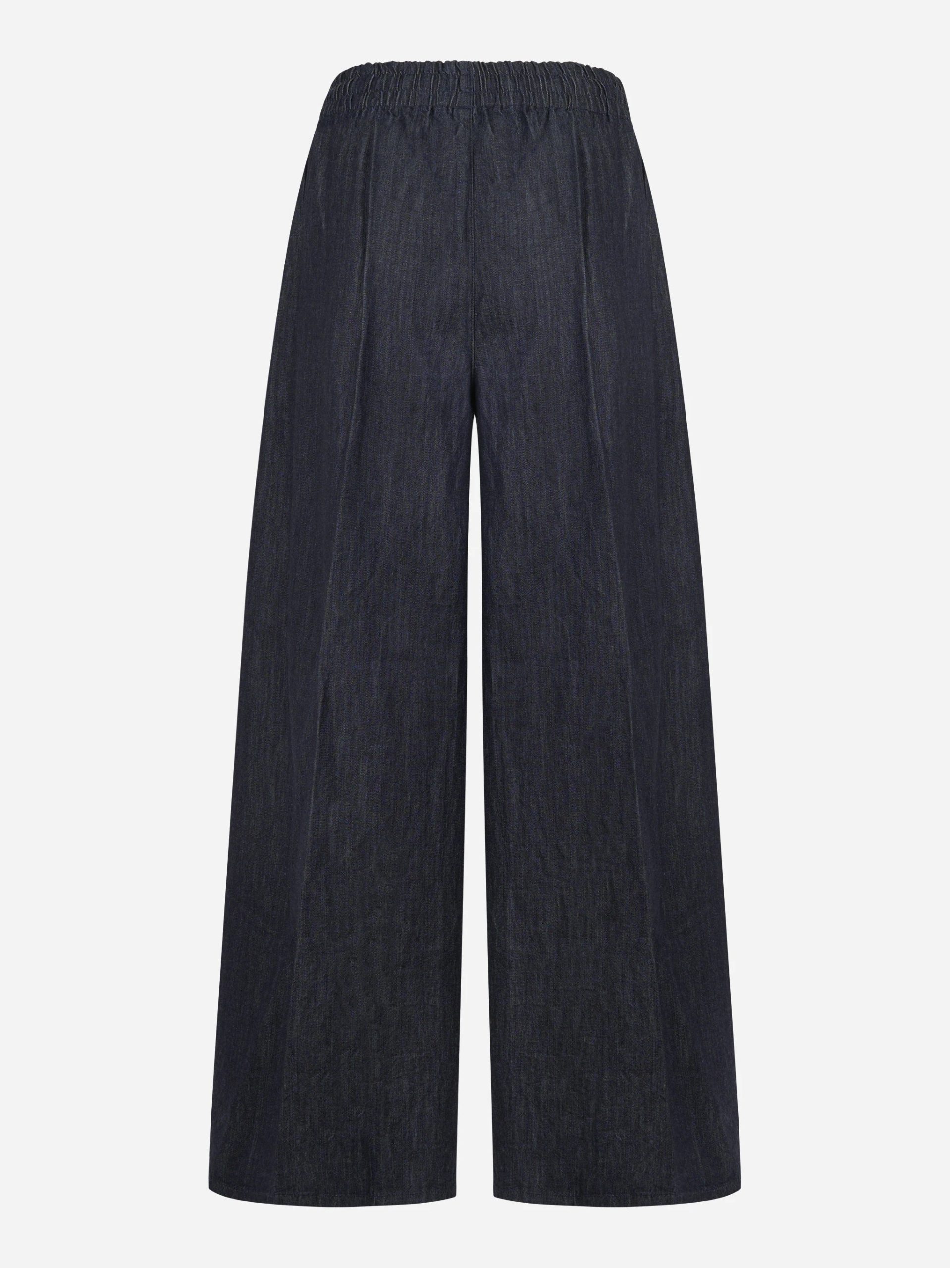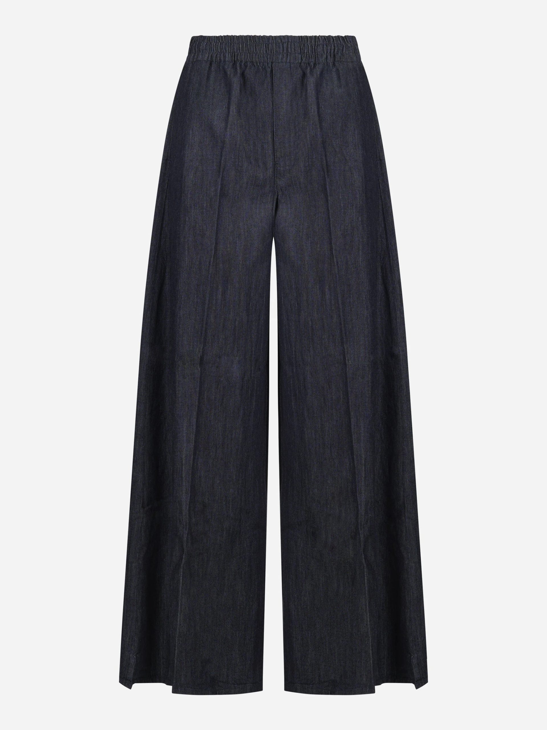 ITEM INFO Pantalone wide leg con elastico in vita Vita elasticizzata Gamba ampia con linea dritta Denim blu scuro Collezione Donna Primavera Estate 2026 Composizione: 100% Cotone. Made in Italy
