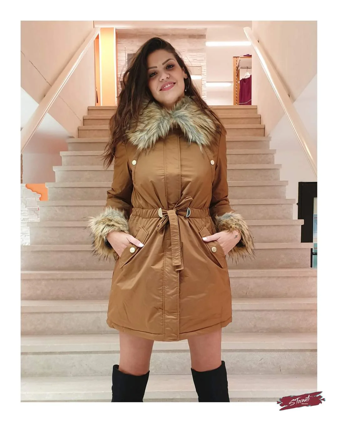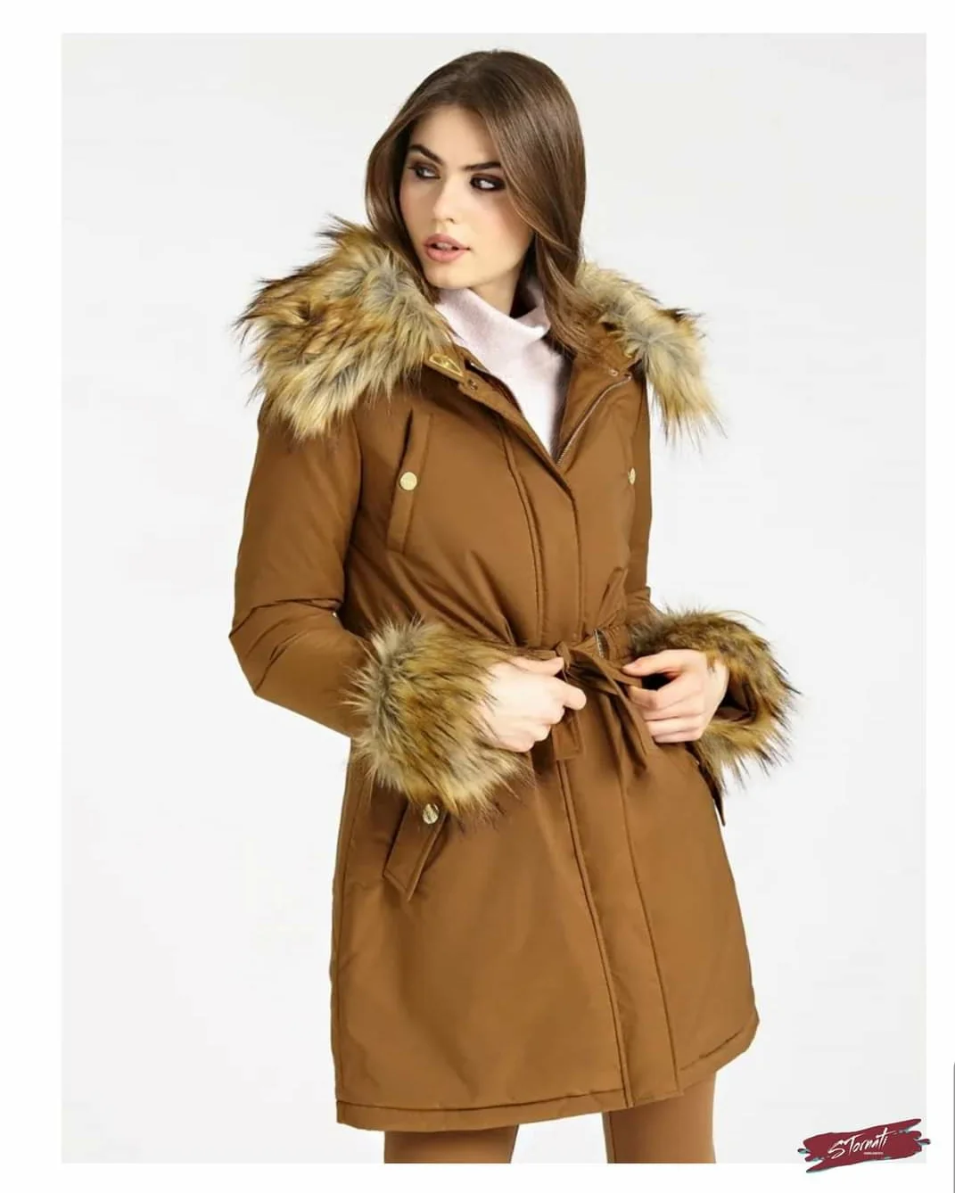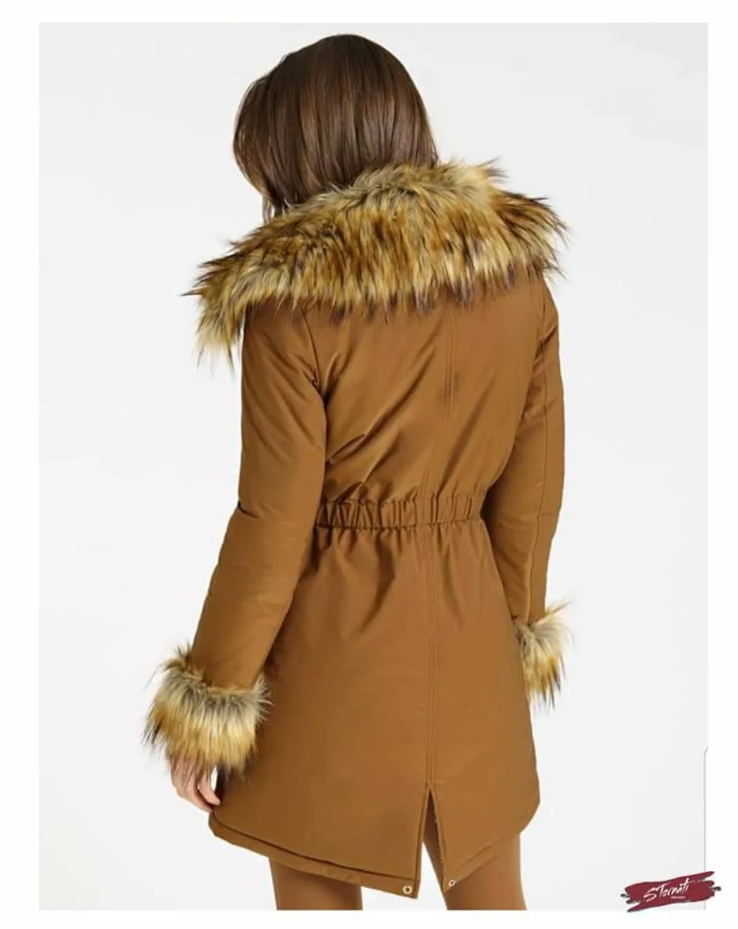 Parka caramello Marciano ecopelo collo e maniche removibile, caldo ecopelo interno e interno tasche felpato. Coulisse regolabile in vita.