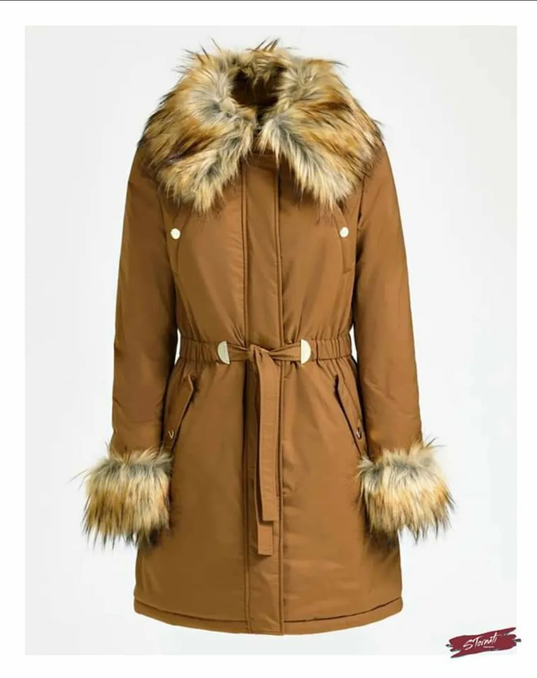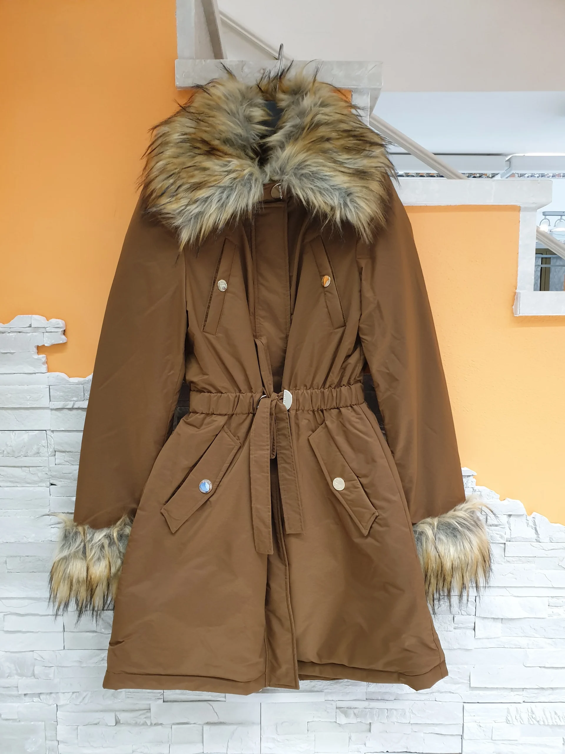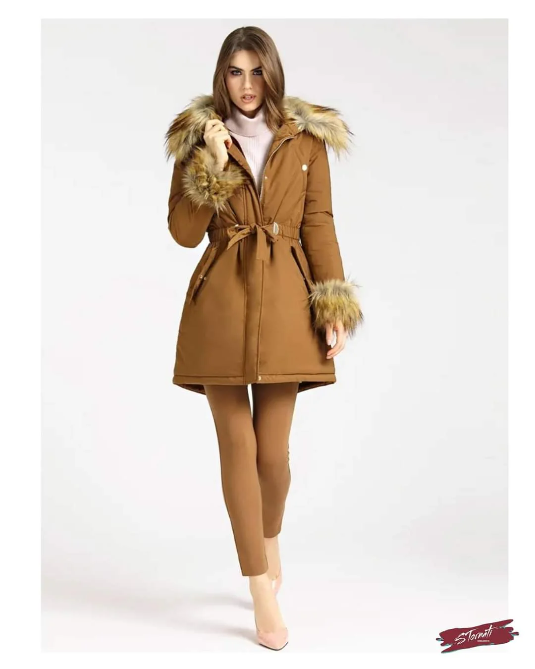 Parka caramello Marciano ecopelo collo e maniche removibile, caldo ecopelo interno e interno tasche felpato. Coulisse regolabile in vita.