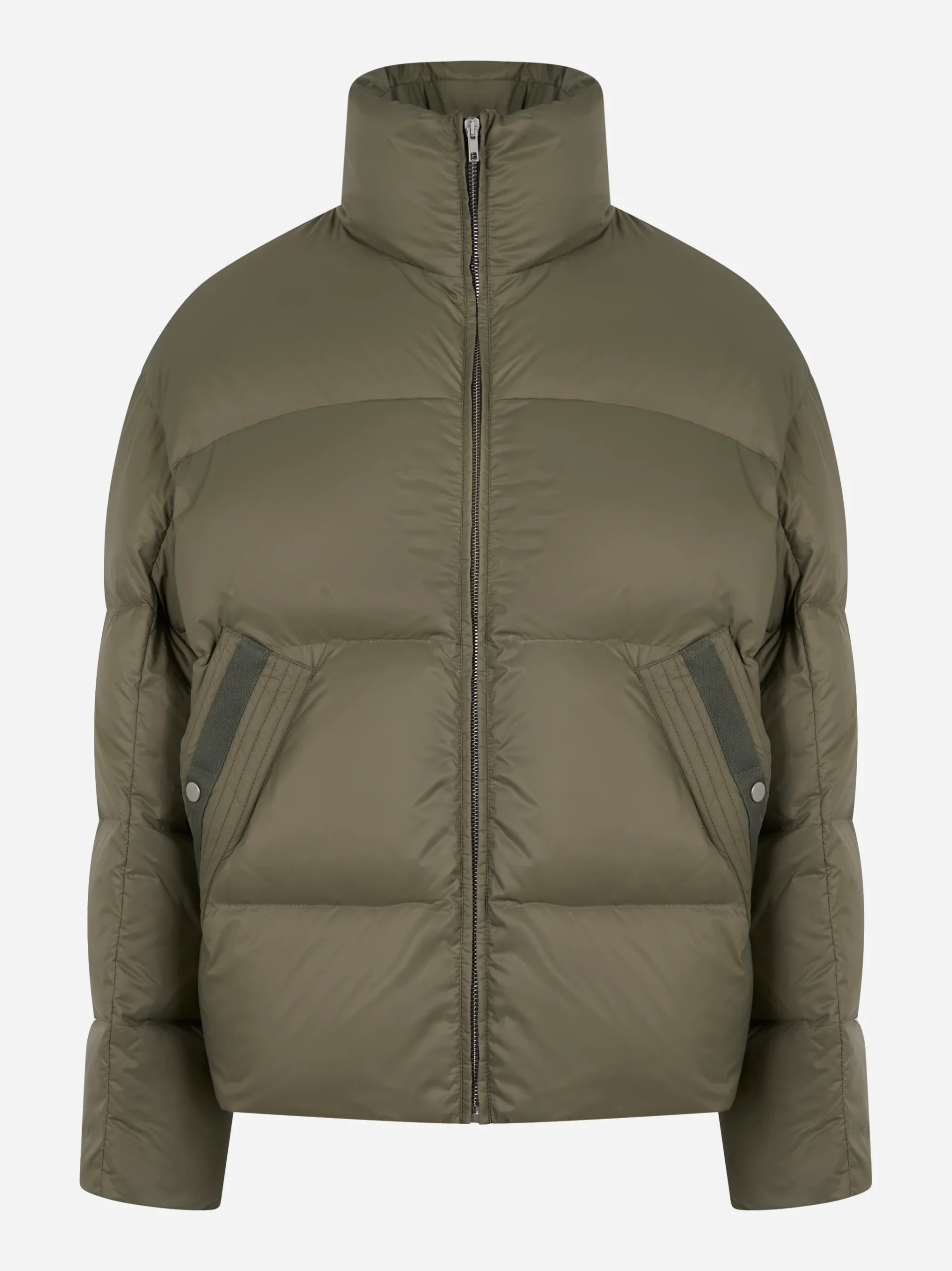 ITEM INFO Piumino in tessuto tecnico color verde militare Collo alto imbottito con zip centrale a doppio cursore Chiusura frontale con zip a vista Tasche laterali oblique con pattina e bottone automatico Vestibilità ampia con volume oversize e spalle scese Dettaglio a righe sul retro del collo Composizione: 100% Poliammide Imbottitura: 90% Piumino, 10% Piuma