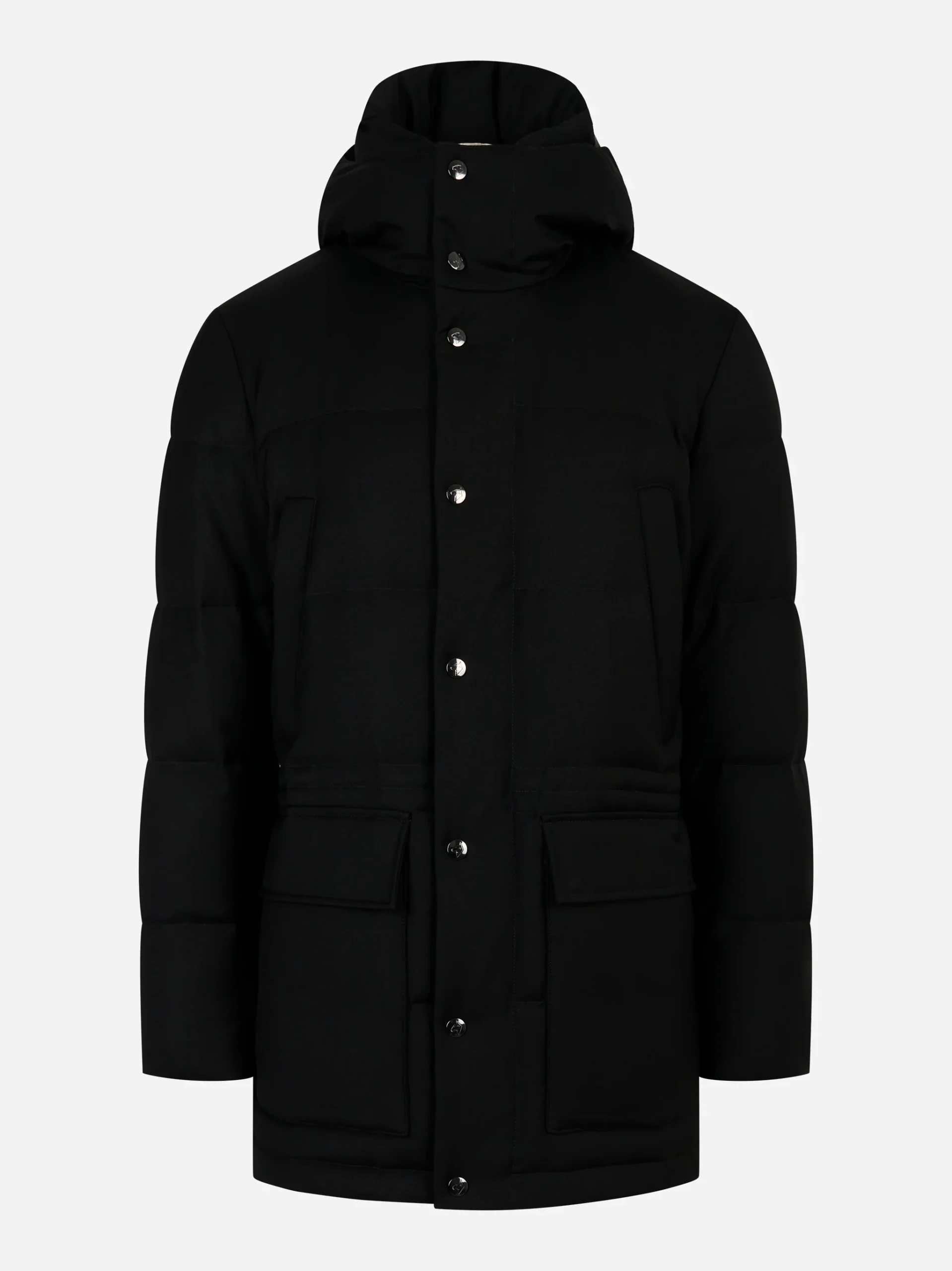 ITEM INFO Piumino lungo con cappuccio color nero Chiusura frontale con zip e bottoni Cappuccio imbottito regolabile Tasche laterali a patta Linea allungata per maggiore protezione Imbottitura termica interna Composizione: 100% Poliestere Made in Italy