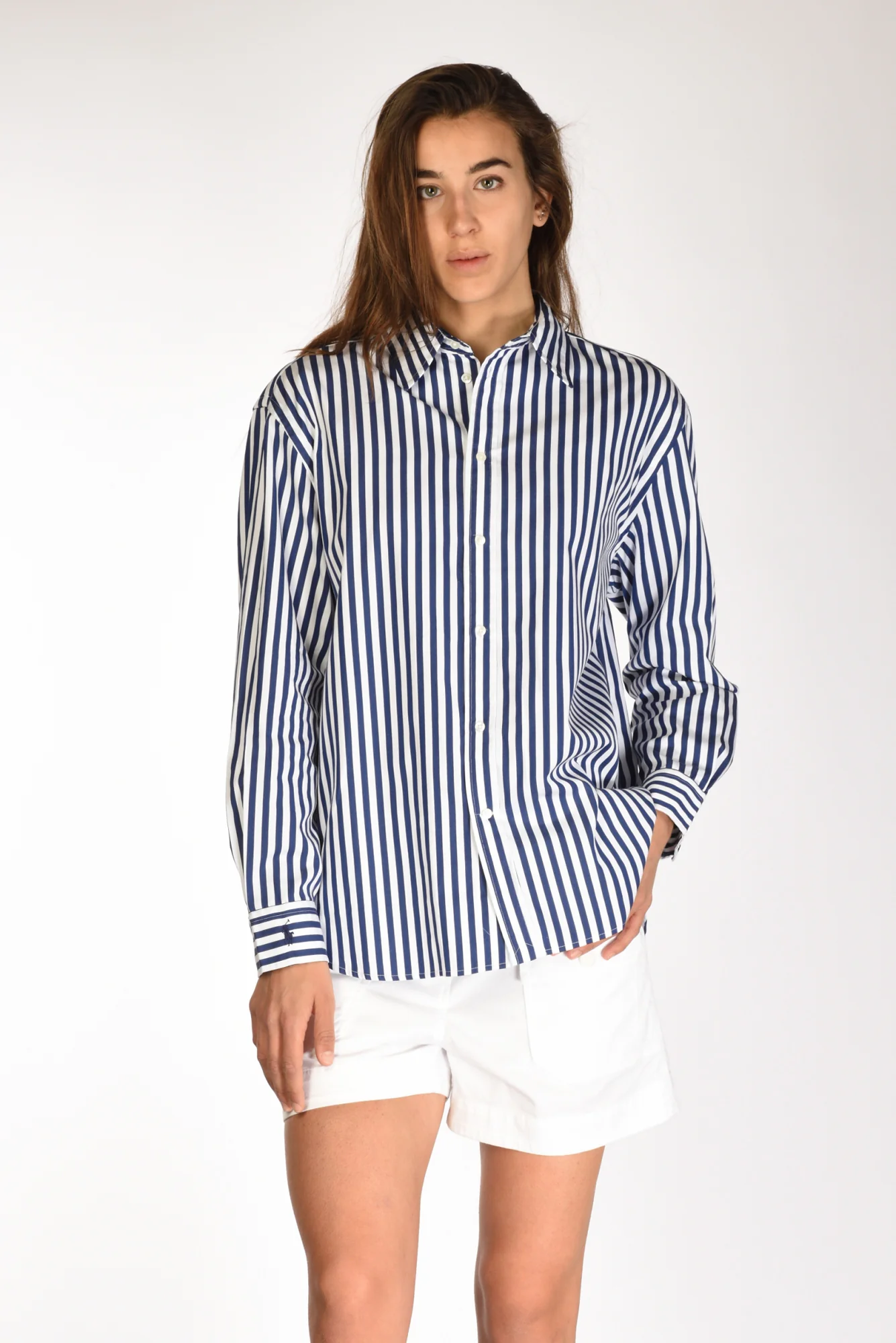 Camicia A Righe, Manica Lunga Con Polsino Logato, Fondo Stondato Ed Asimmetrico, Cannoncino Posteriore, Chiusura Bottoni A Vista, Vestibilita’ Over, Made In Indonesia, Composizione 100 Cotone.legenda Tg:0=36 2=38 4=40 6=42 8=44 10=46