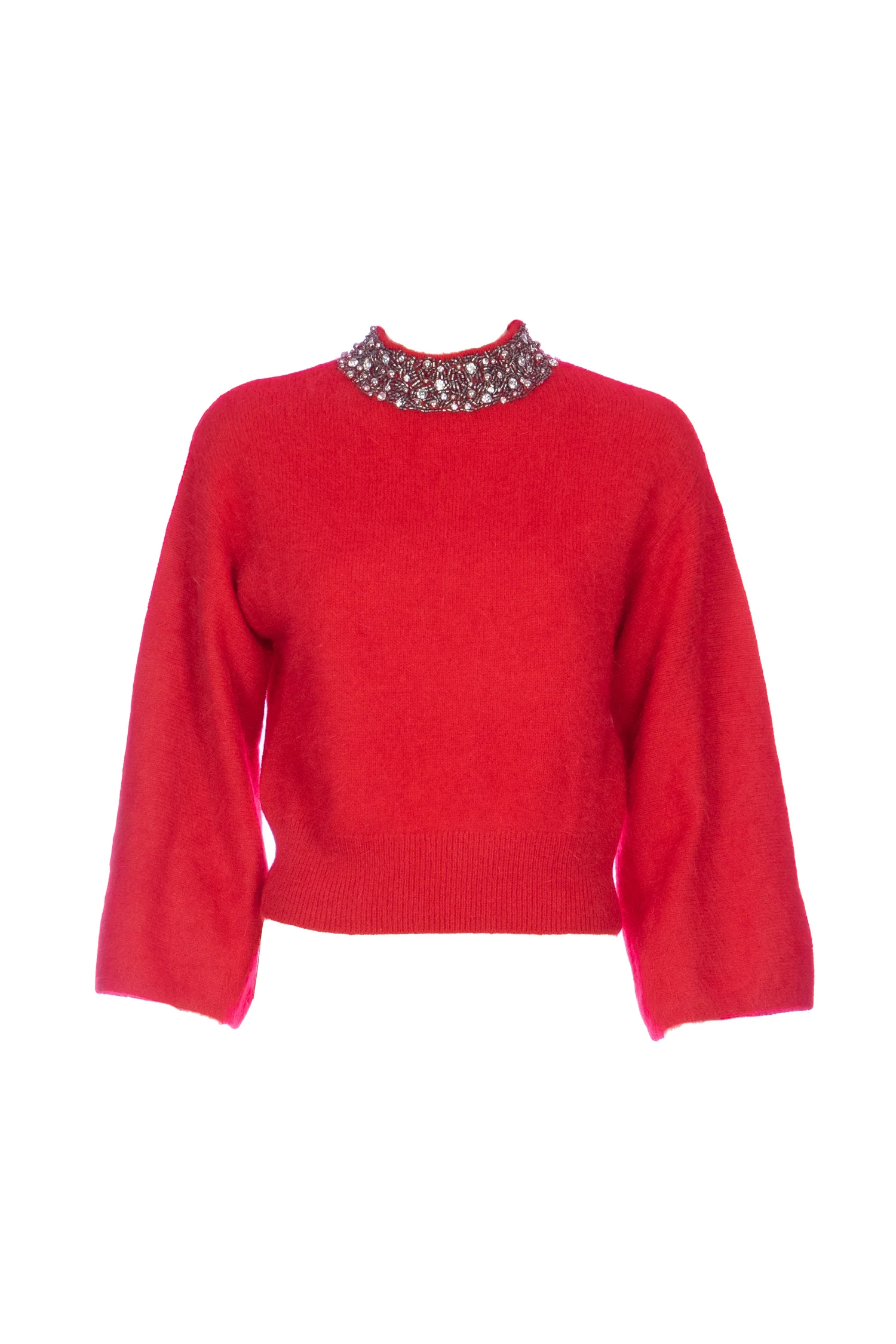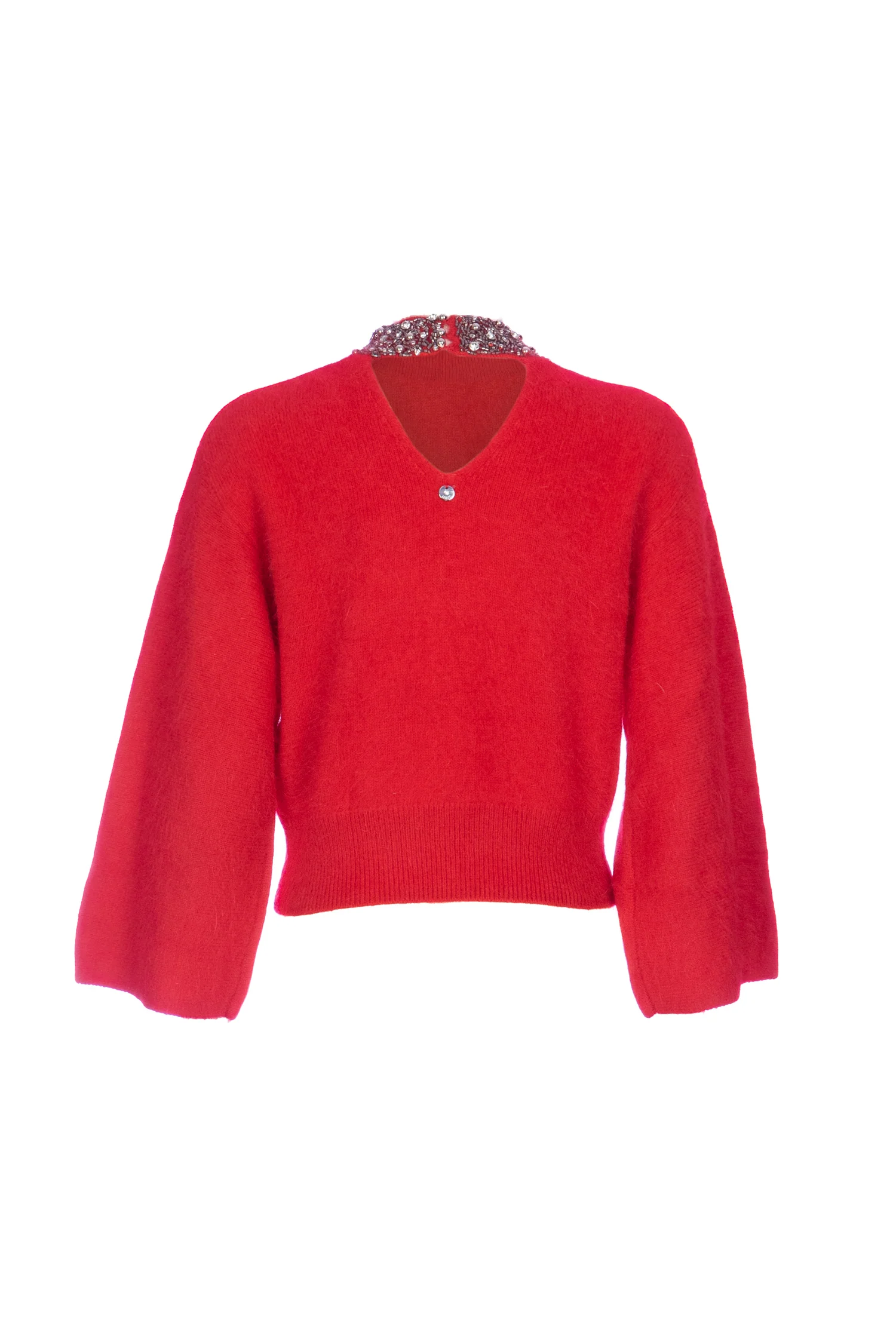 Pullover rosso in angora con ricamo gioiello