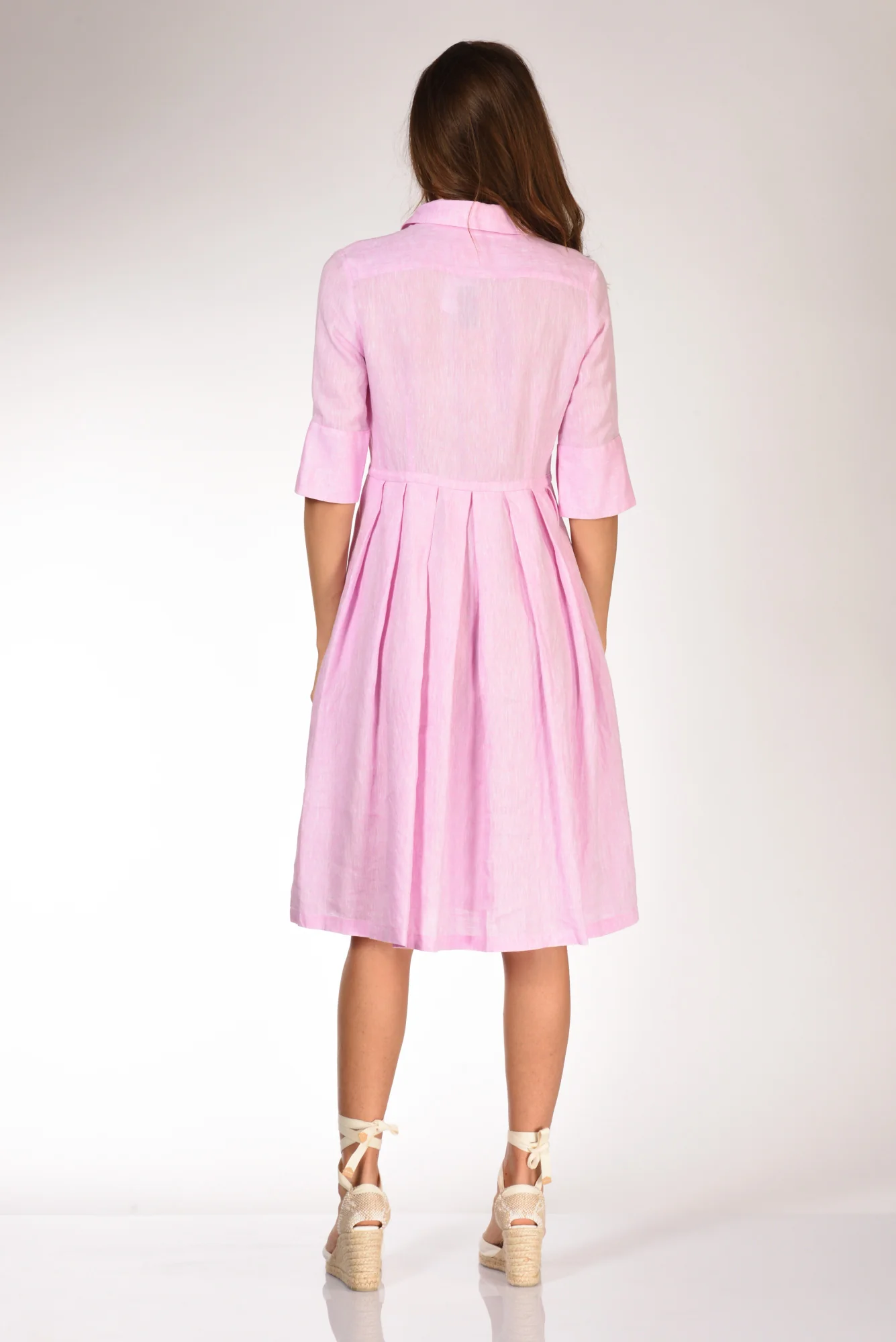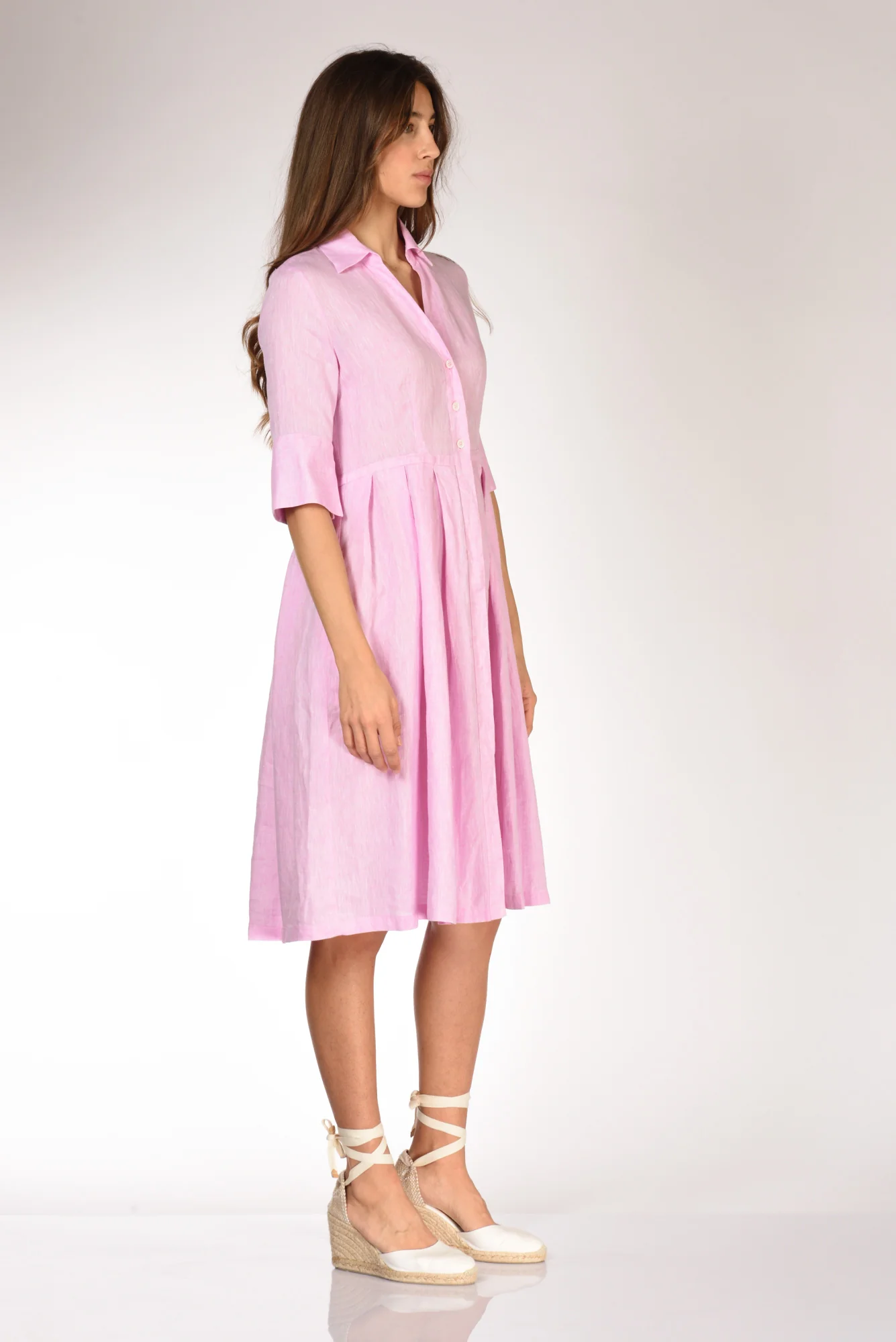Abito Midi A Chemisier Tagliato In Vita, Maniche Al Gomito Con Polsino Alto Chiuso Da Bottone, Scollo A V Con Colletto A Camicia, Gonna A Pieghe Piatte, Tasche Inserite Lateralmente, Chiuso Da Bottoni A Vista E Parte Nascosti, Vestibilita’ Regular, Made In Tunisia, Composizione 100 Lino