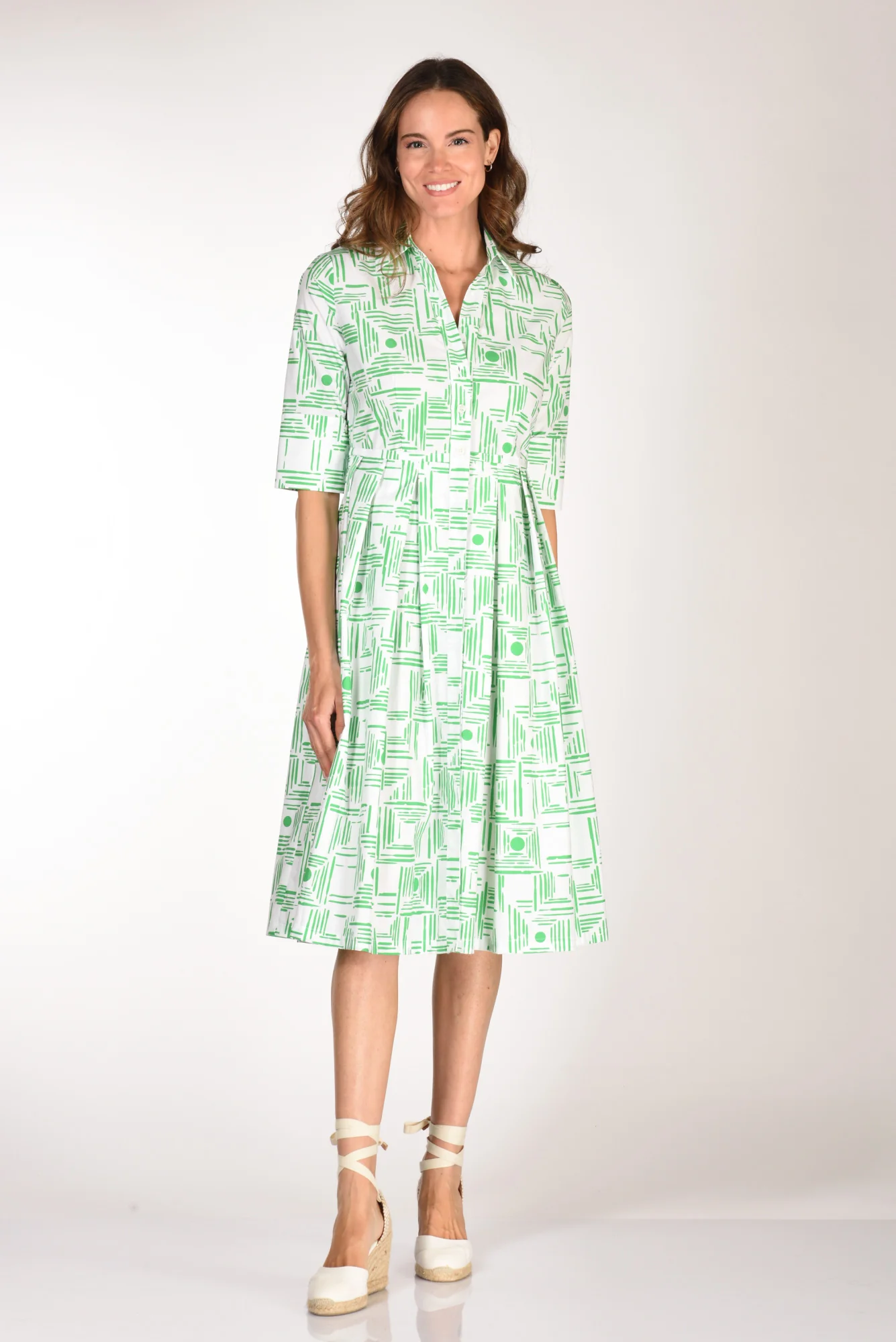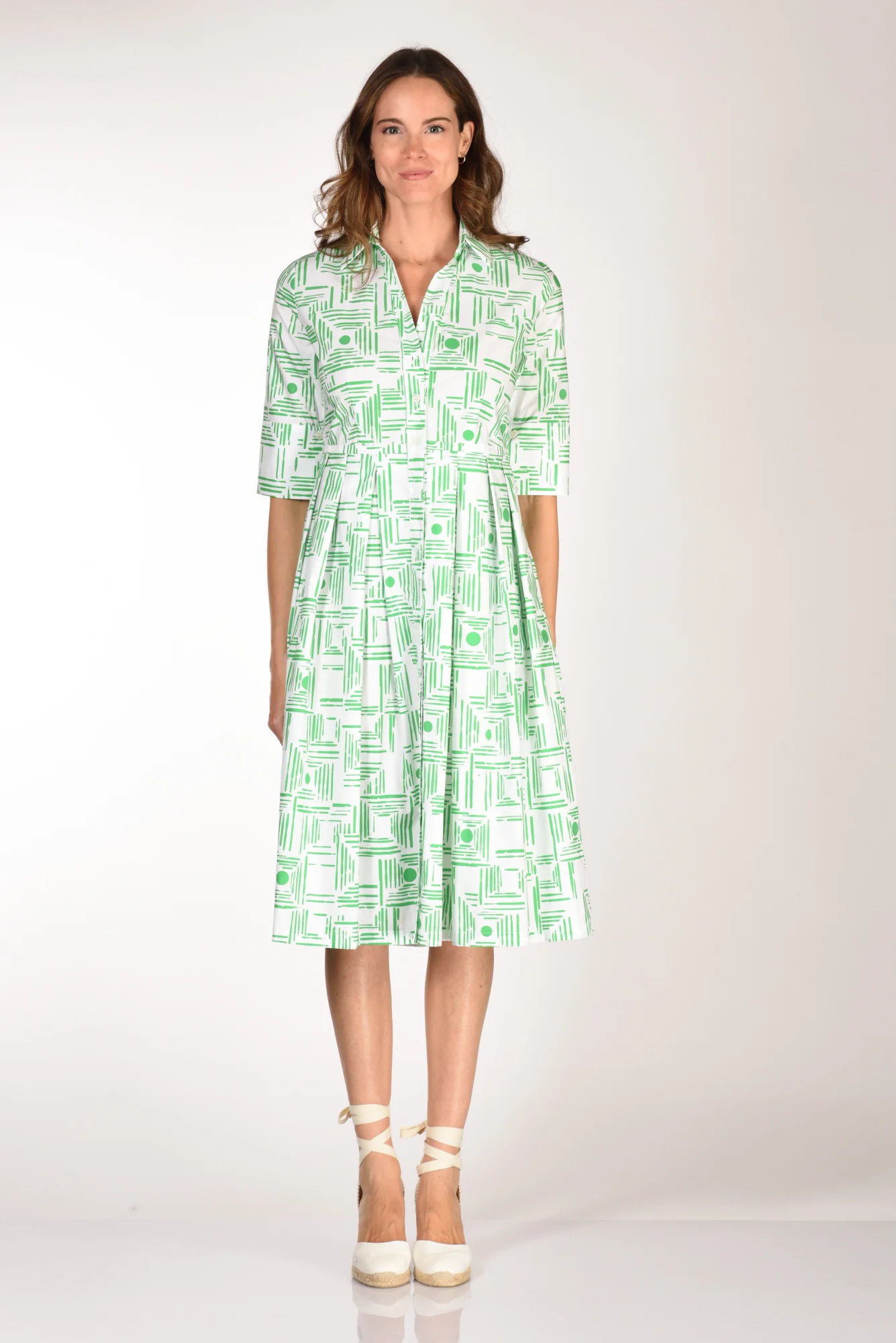 Abito Chemisier, Collo A Camicia, Scollo A V, Mezza Manica Con Alto Polsino Chiuso Da Bottone, Gonna A Pieghe Piatte, Tasche Laterali Inserite, Chiuso Da Bottoni A Vista, Vestibilita’ Regular, Composizione 100 Cotone, Made In Tunisia