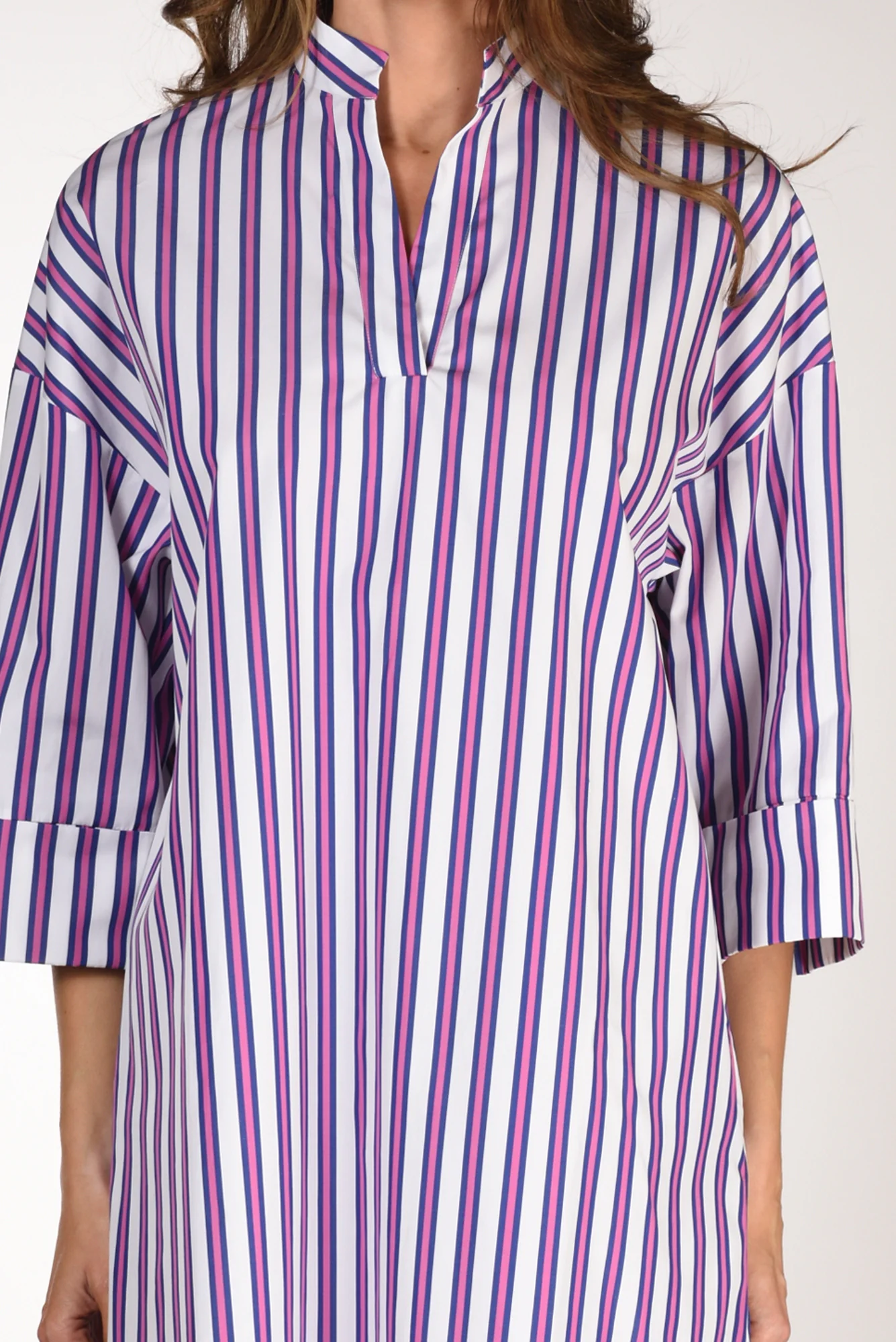 Abito Over A Righe, Scollo A V Profondo, Spalla Scesa, Manica 3/4 Con Risvolto, Tasche Inserite Lateralmente, Sfondo Piega Posteriore, Fondo Stondato E Lunghezze Asimmetriche, Vestibilita’ Over, Made In Tunisia, Composizione 100 Cotone