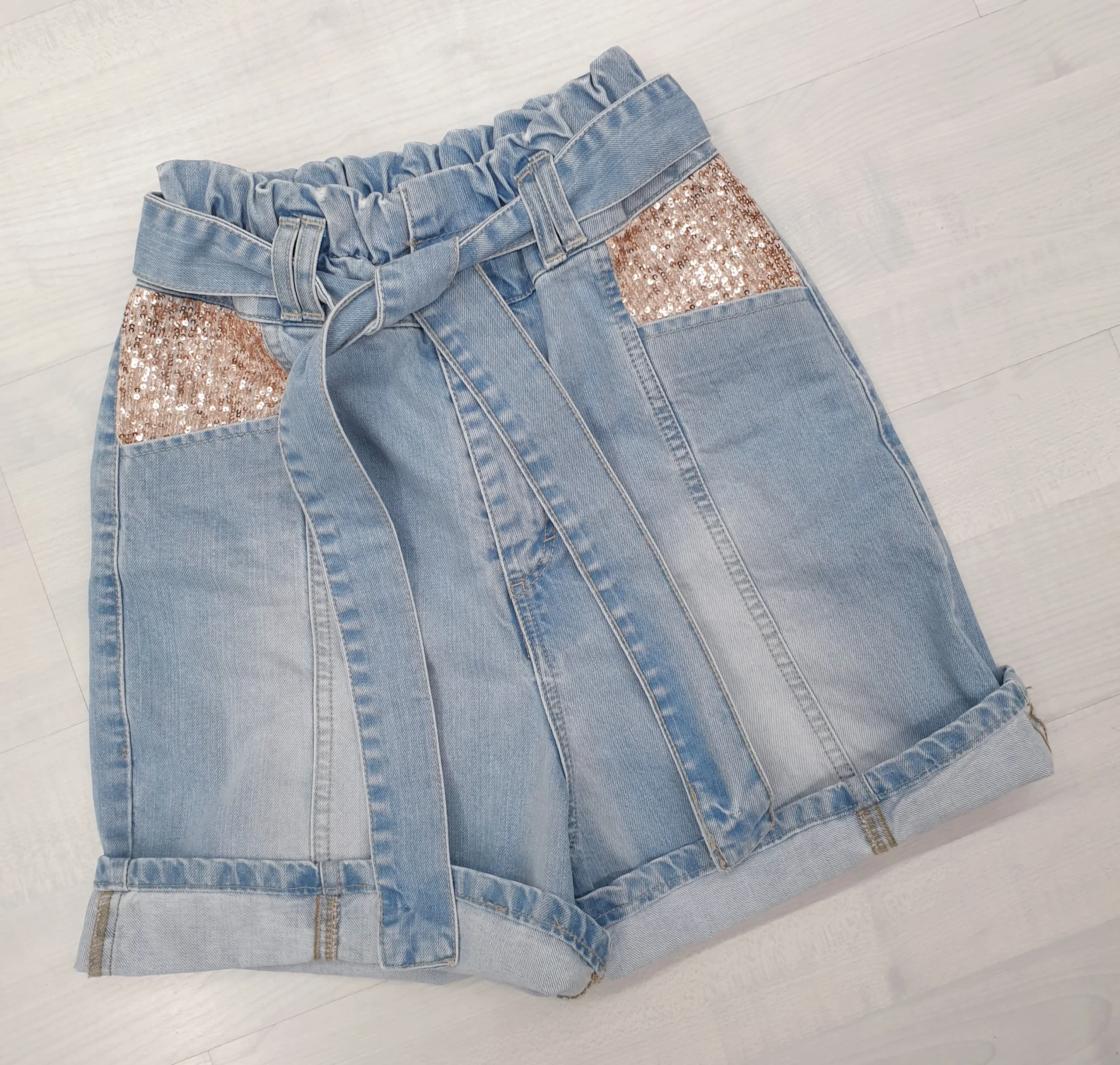 Shorts jeans gamba morbida effetto gonna-pantalone. Vita alta con elastico e fusciacca, tasche inserto pailettes gold, risvolto removibile.