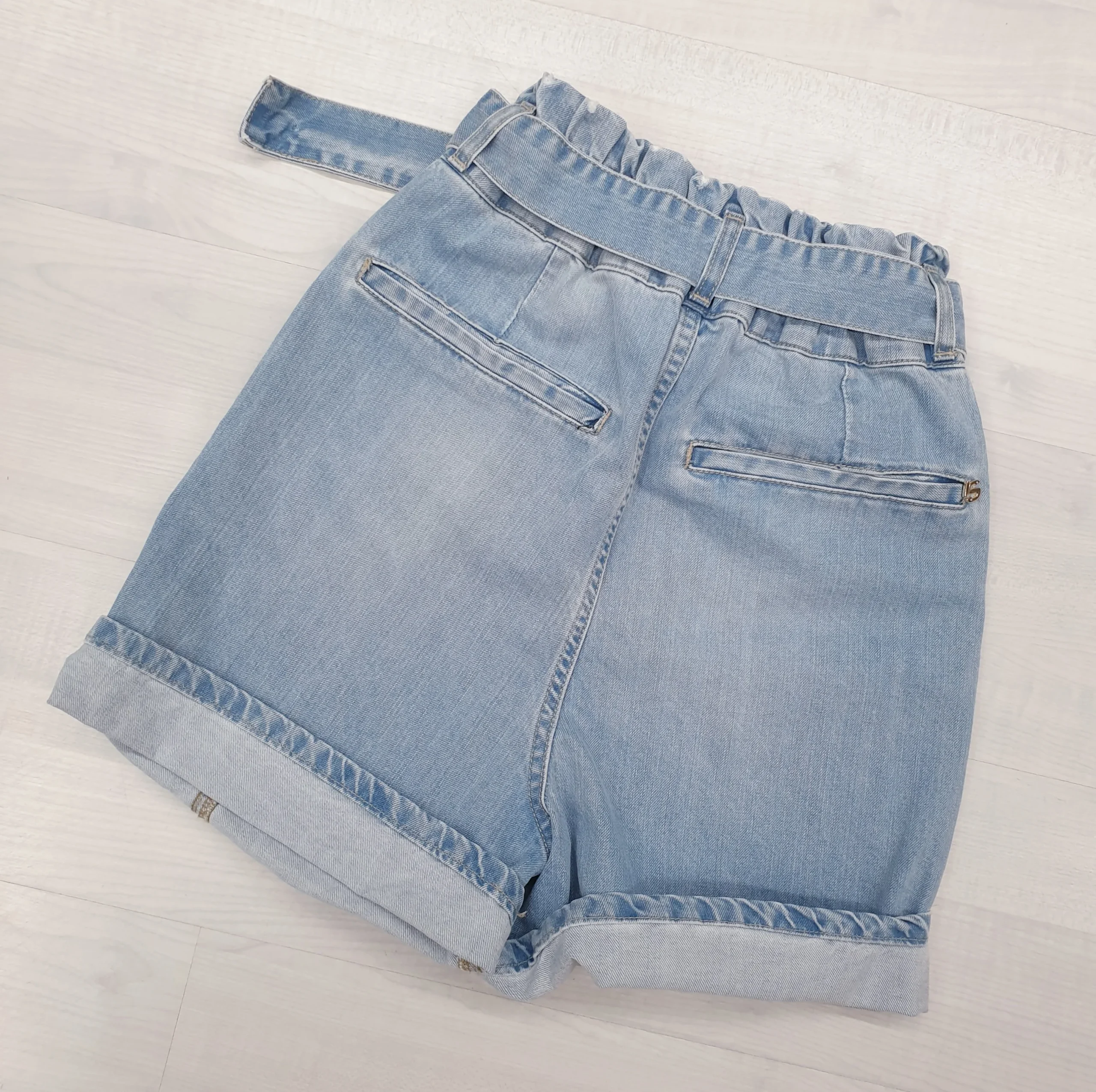 Shorts jeans gamba morbida effetto gonna-pantalone. Vita alta con elastico e fusciacca, tasche inserto pailettes gold, risvolto removibile. Composizione: 98% Cotone 2% Elastan MADE IN ITALY
