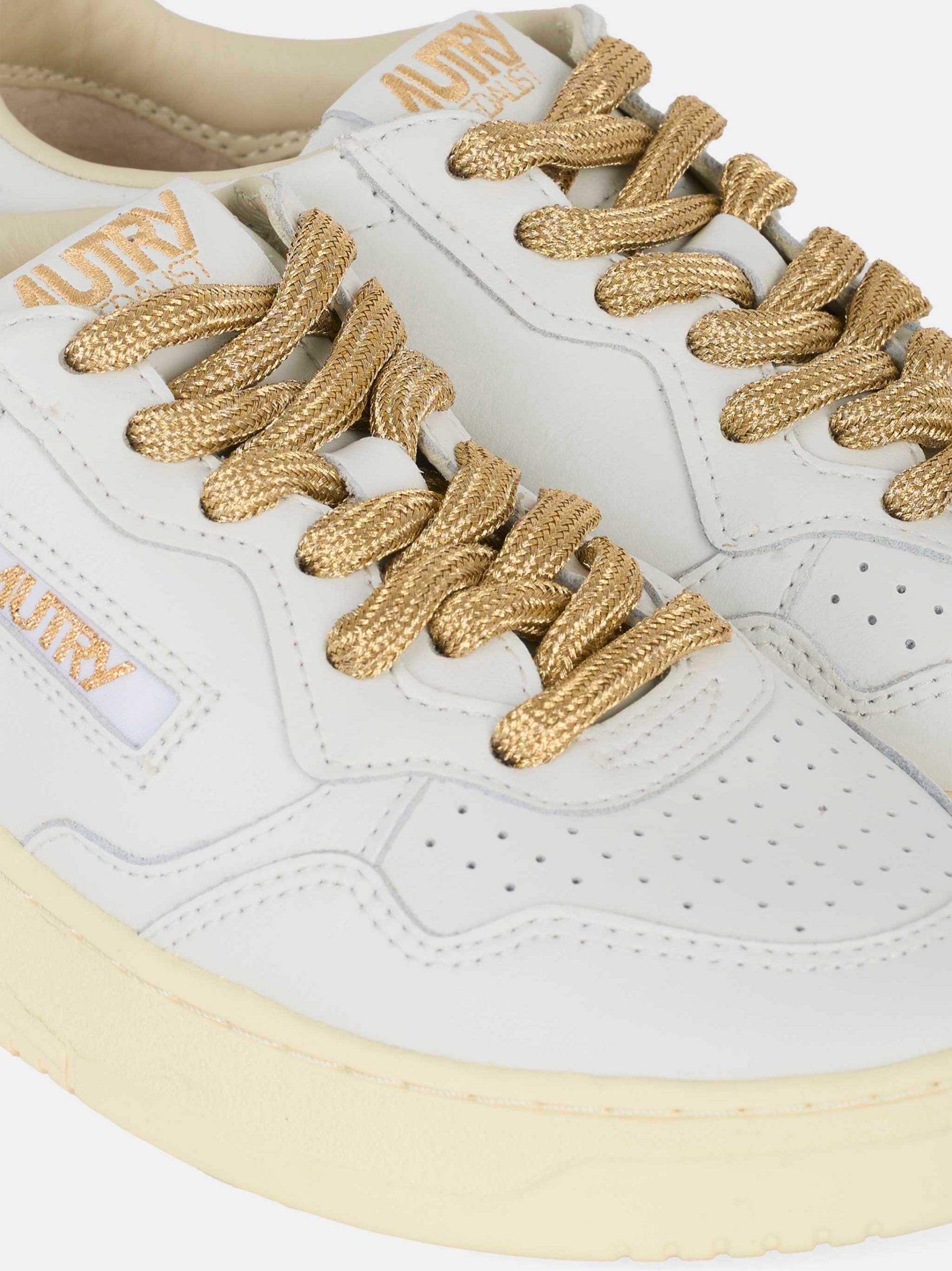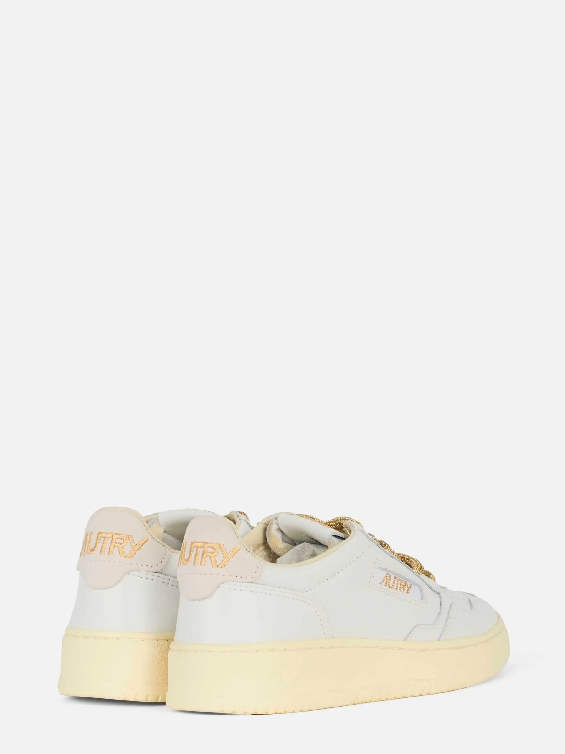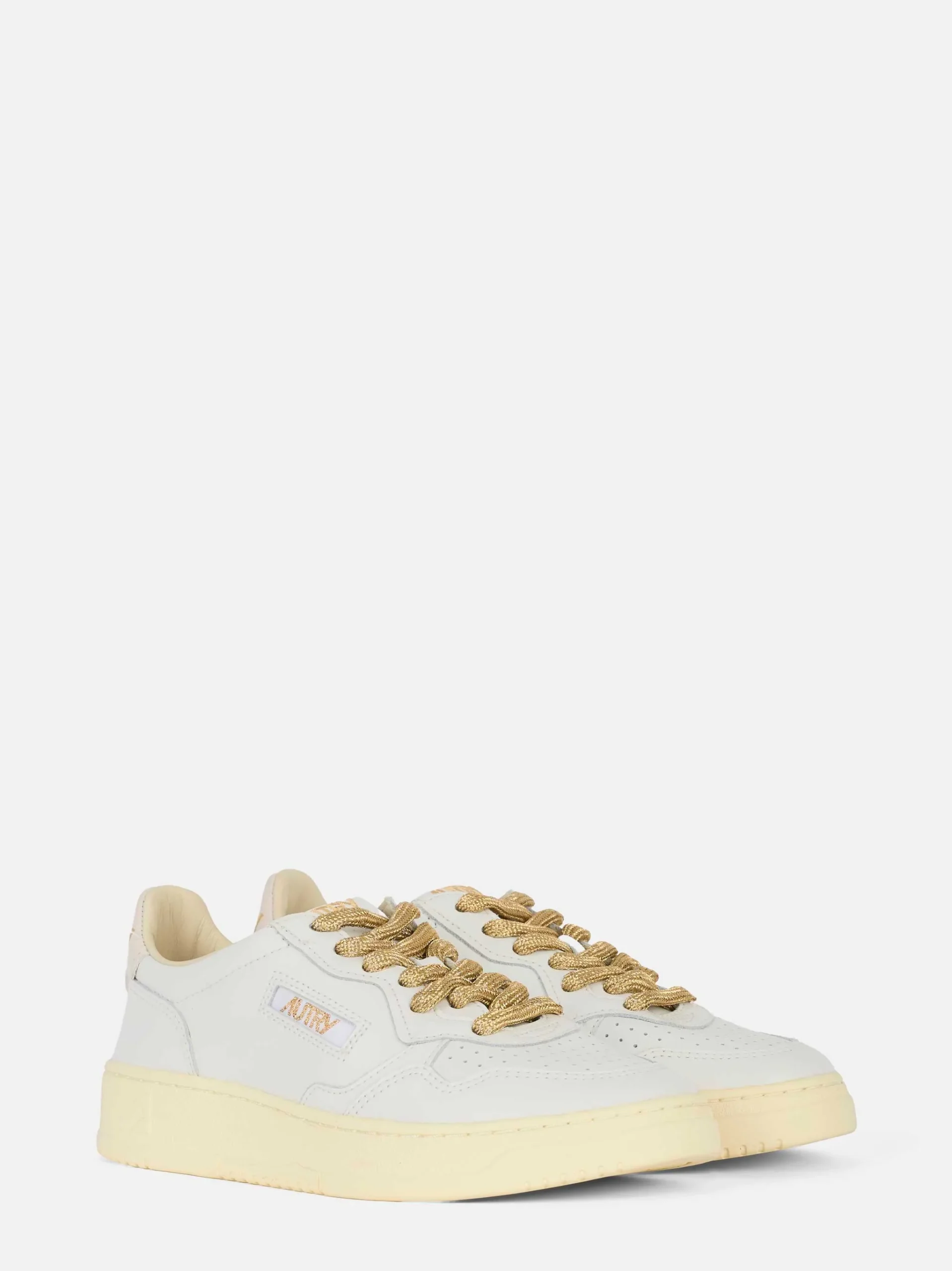 ITEM INFO Sneakers Medalist Low in pelle bianca Dettagli a contrasto con logo Autry dorato Inserti sul tallone in suede beige Punta forata per aerazione Lacci in cotone color oro intrecciato Suola in gomma vintage effetto retrò Composizione: Pelle e Suede