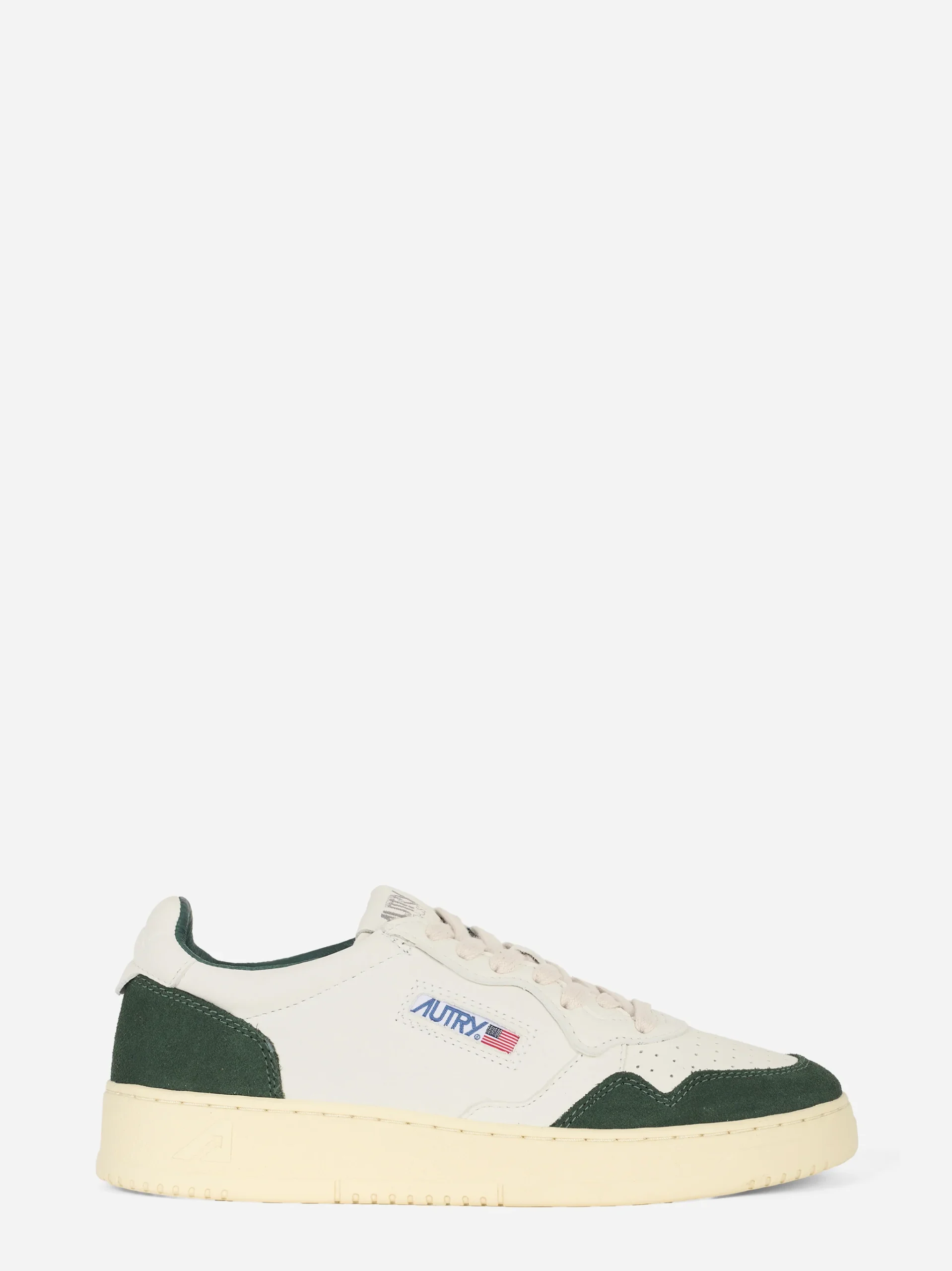 ITEM INFO Sneakers Medalist Low in pelle bianca Inserti in suede verde scuro su tallone e punta Logo Autry con bandiera USA ricamato sul lato Punta traforata per maggiore traspirazione Allacciatura con lacci piatti in cotone Suola in gomma vintage con profilo cucito Composizione: Pelle e Suede
