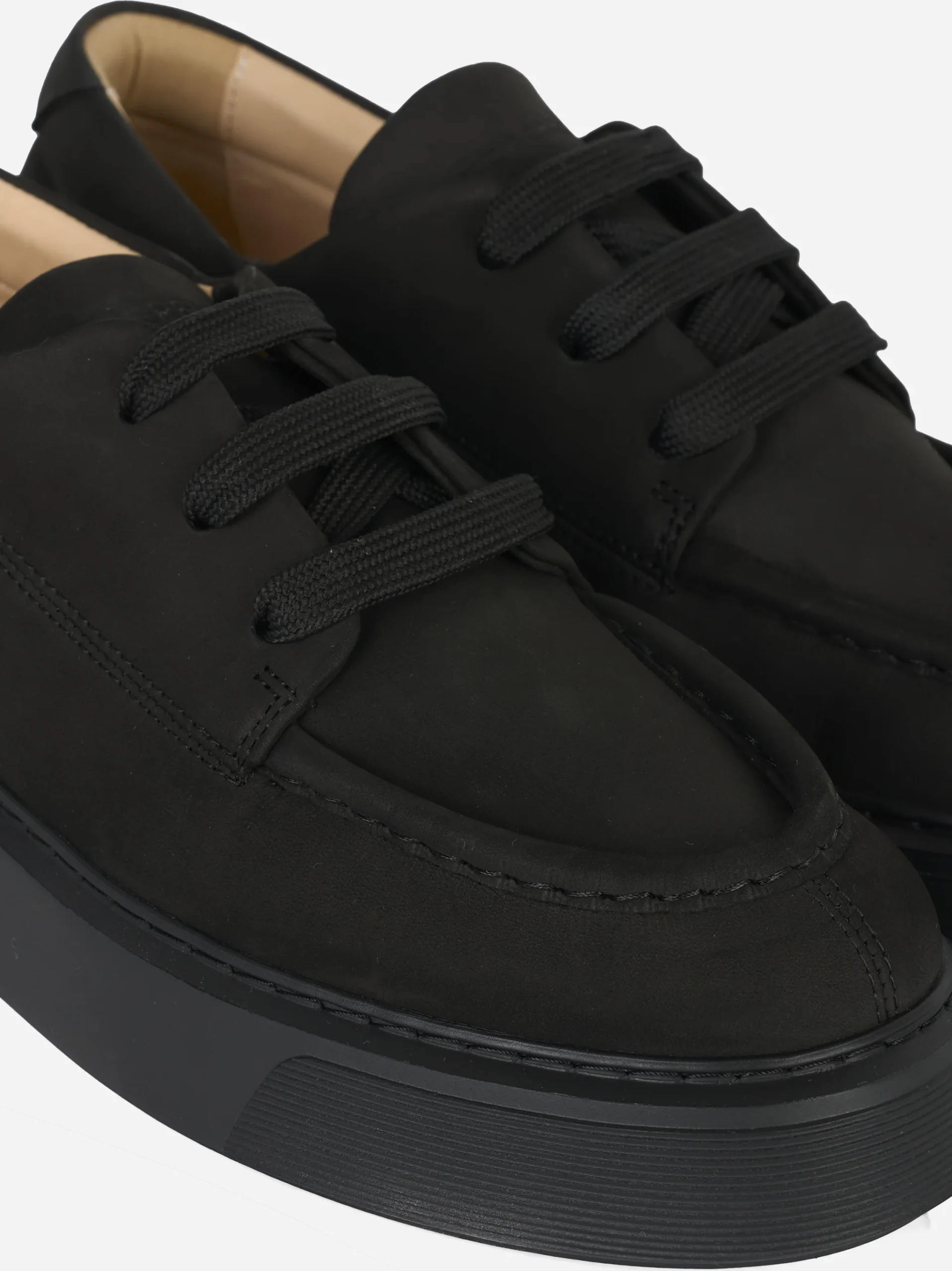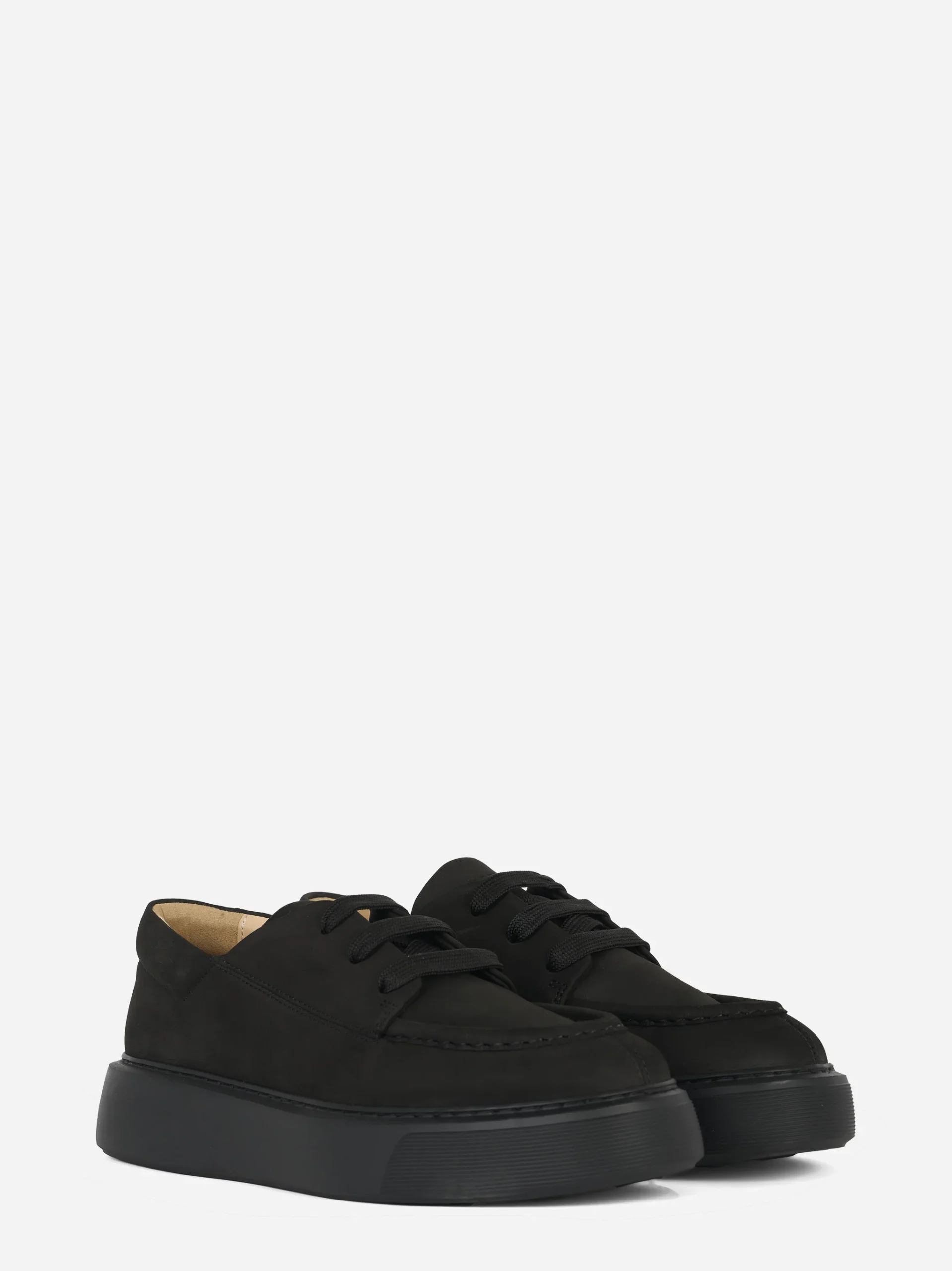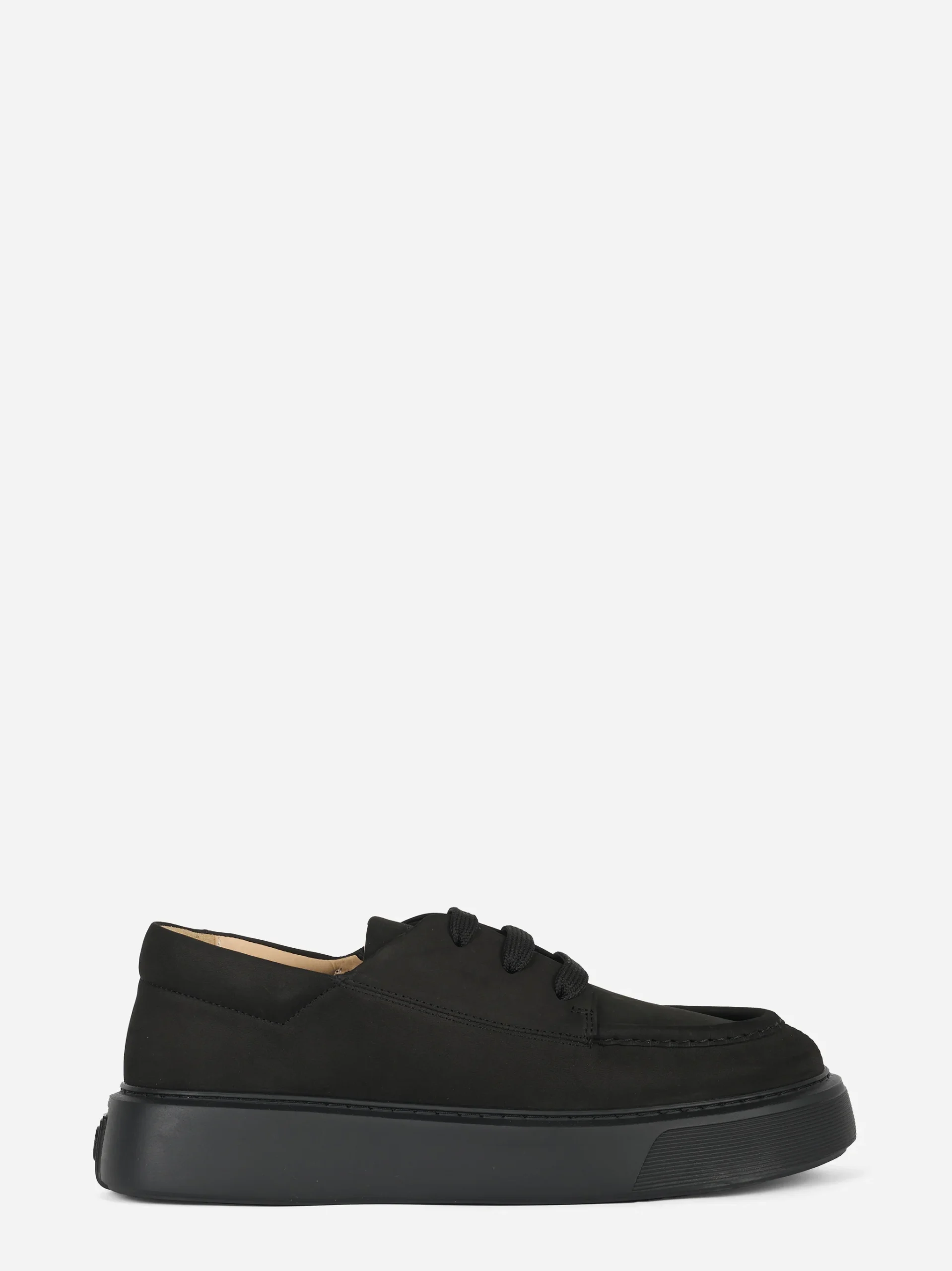 ITEM INFO Sneakers The Tahoe in nabuk nero Design essenziale con tomaia liscia e cuciture tono su tono Lacci spessi in cotone a contrasto opaco Suola oversize in gomma a profilo alto Fodera interna in pelle naturale Dettaglio logo impresso sul tallone Composizione: 100% Pelle
