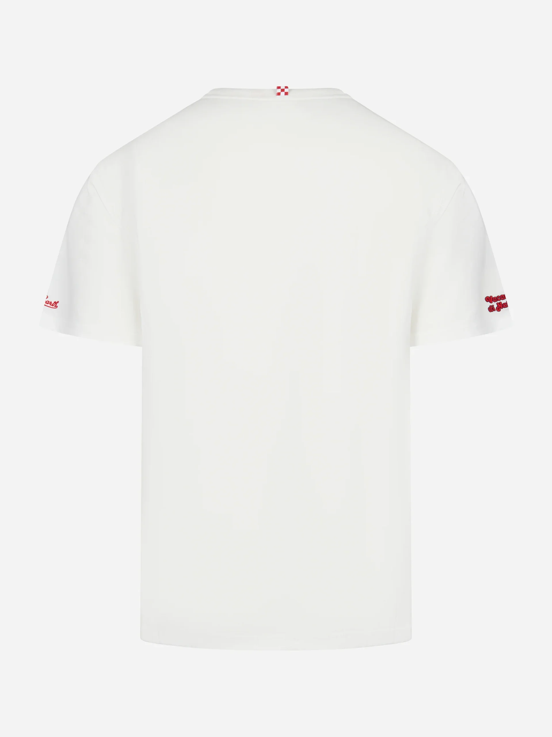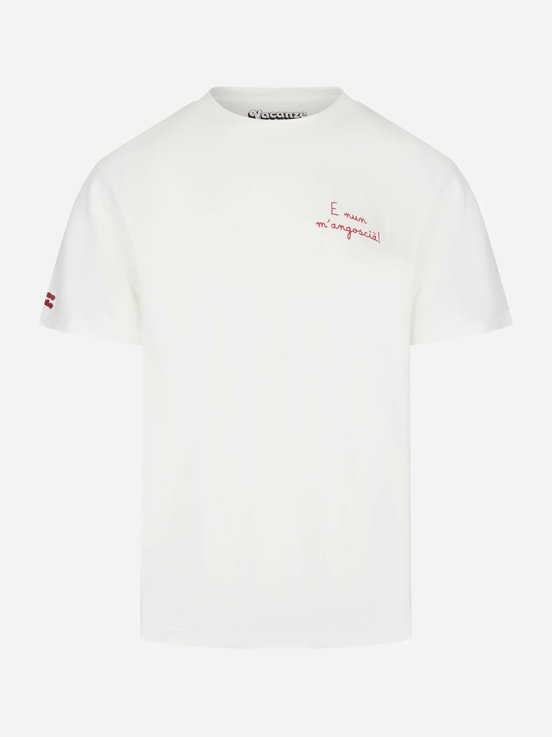 ITEM INFO T-shirt in cotone bianco Scritta E Nun M’ Angoscià ricamata sul petto Collo tondo Maniche corte Vestibilità classica Finiture semplici Composizione: 100% Cotone Made in Italy