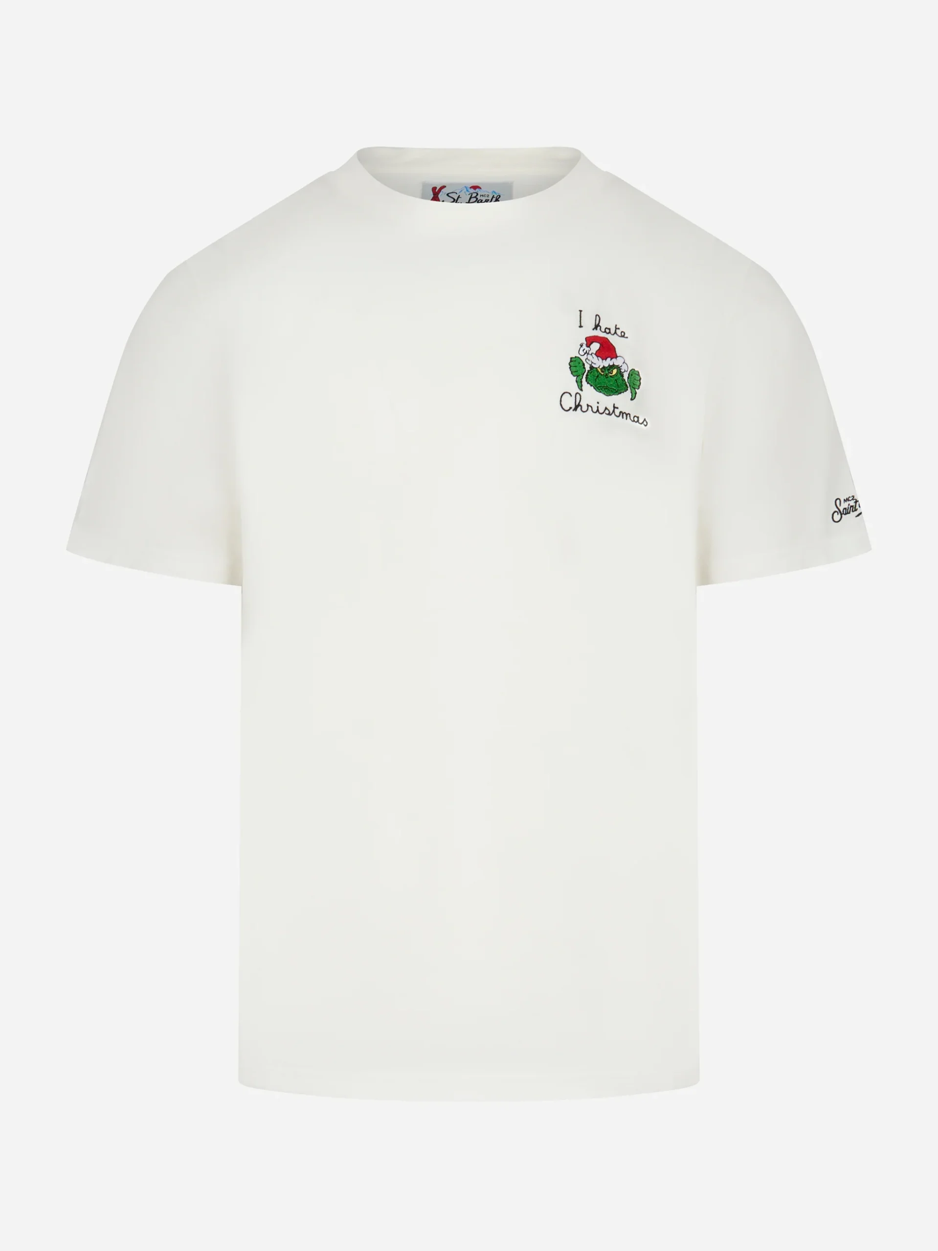 ITEM INFO T-shirt in cotone bianco Ricamo I Hate Christmas con Babbo Natale sul petto Collo rotondo Maniche corte Taglio regolare Orlo semplice con finitura pulita Composizione: 100% Cotone Made in Italy