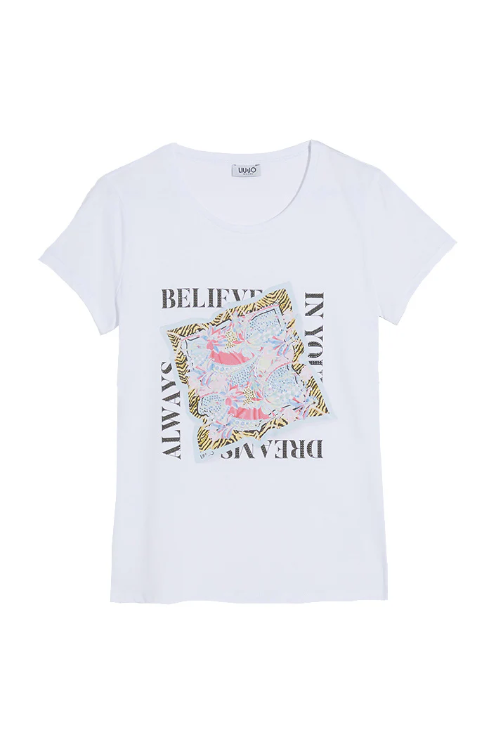 T-shirt bianca con stampa believe e applicazione