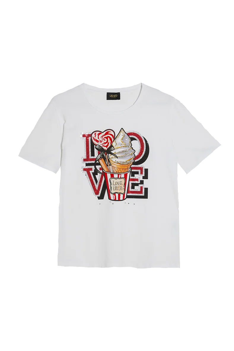 Codice Prodotto: CA2258J5003-S9909 Dettagli:• T-shirt a maniche corte • Filati in cotone stretch • Taglio girocollo • Stampa sul davanti • Pietre gioiello applicate Composizione: 95% Cotone, 5% Elastan Vestibilità:Regolare