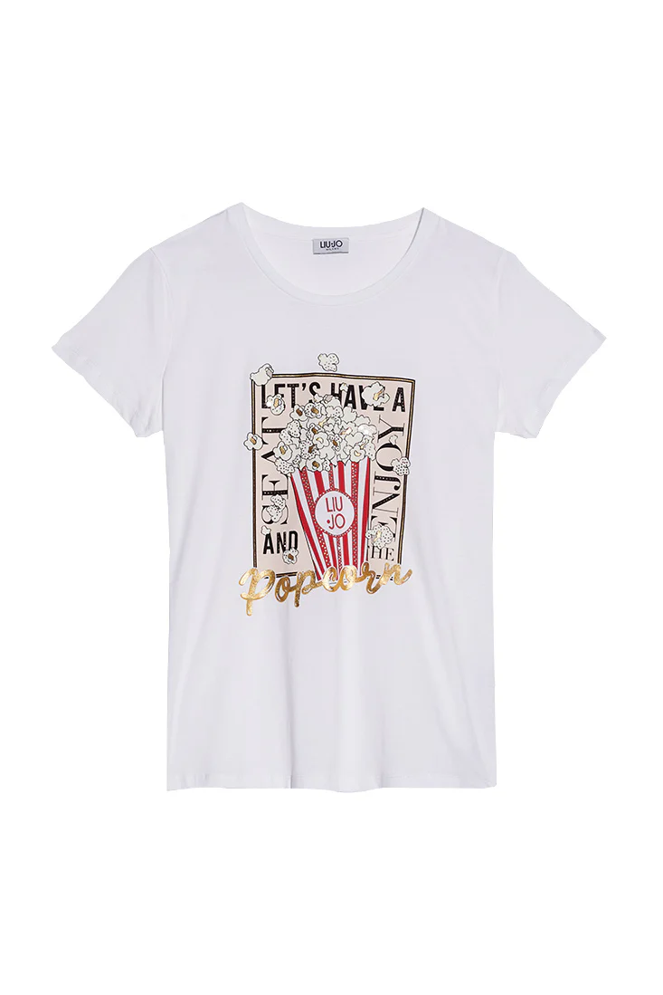 T-shirt bianca con stampa popcorn e applicazioni