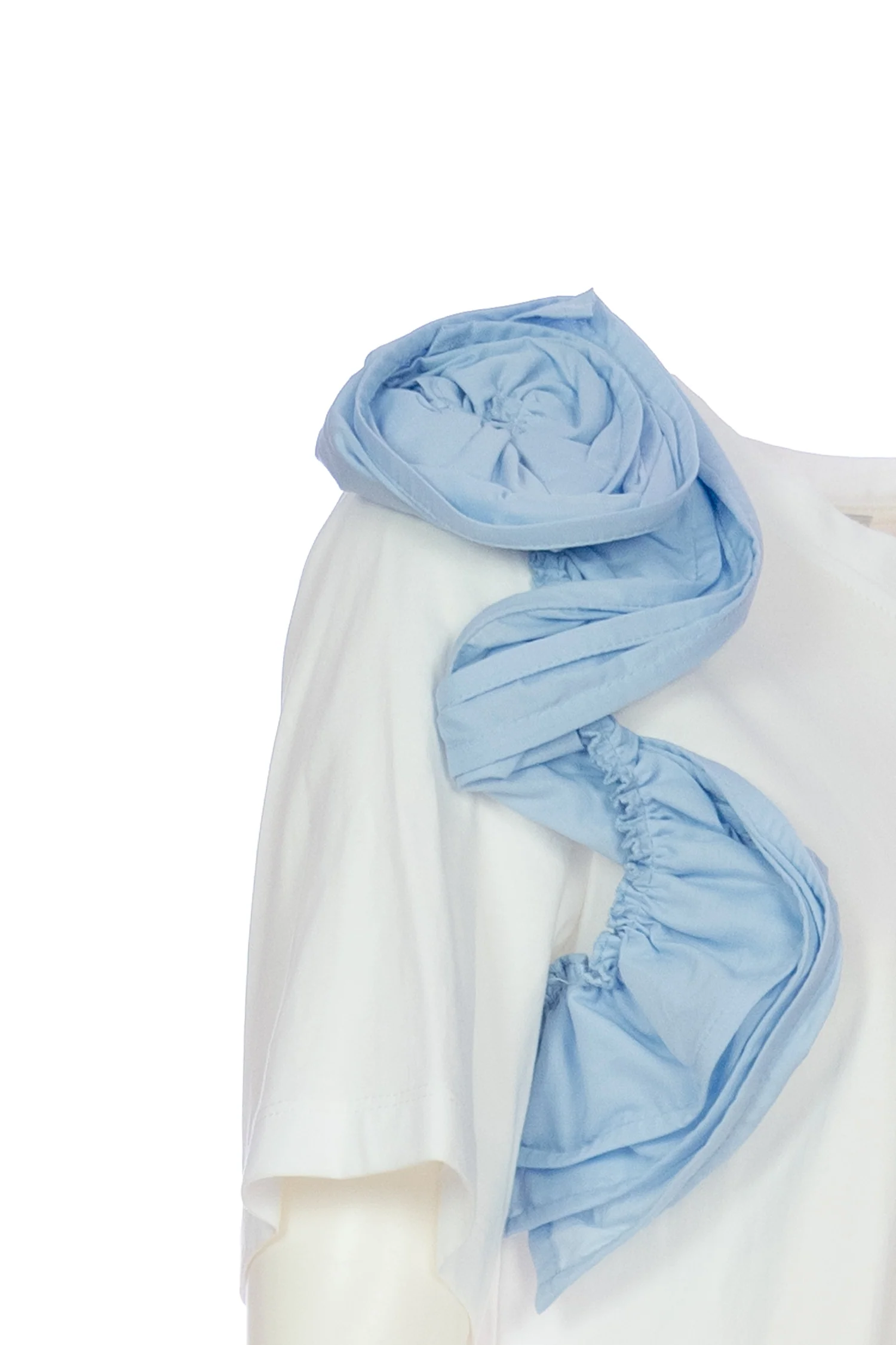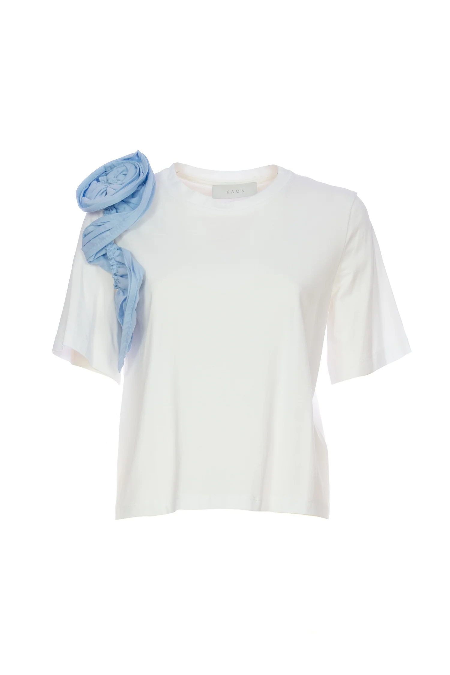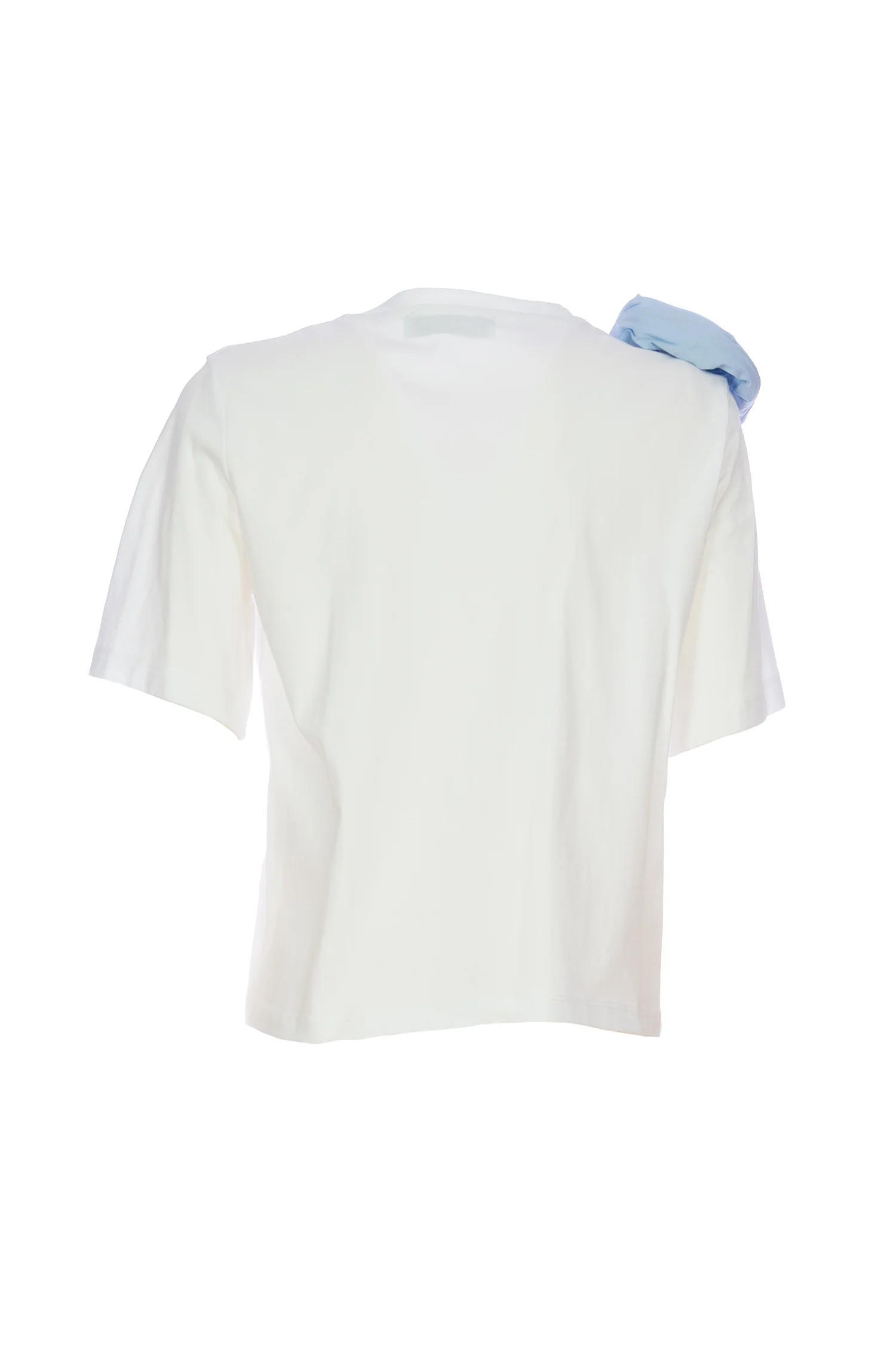 T-shirt bianca in cotone con volant azzurro