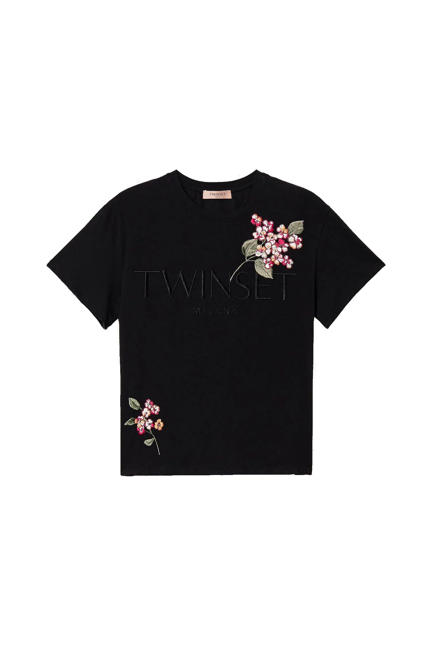 T-shirt nera con logo e ricamo floreale