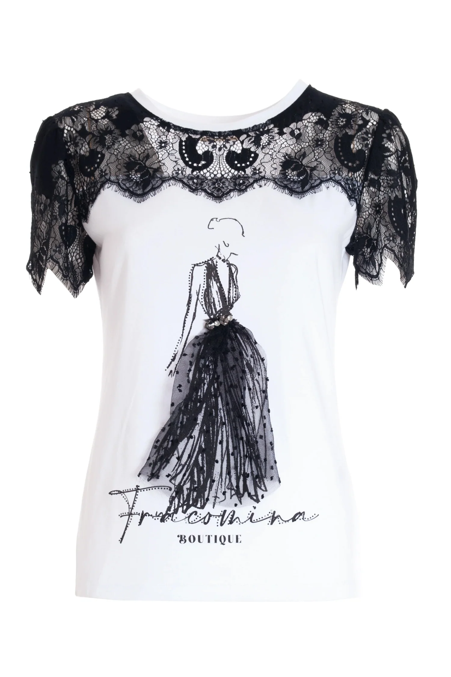 Codice Prodotto: FR22ST3021J401G1-324 Dettagli:T-shirt regular in jersey con inserti in pizzo, girocollo, grafica sul davanti, e con maniche corte in pizzo. COMPOSITION: COTTON 95% ELASTANE 5% Vestibilità:Regolare