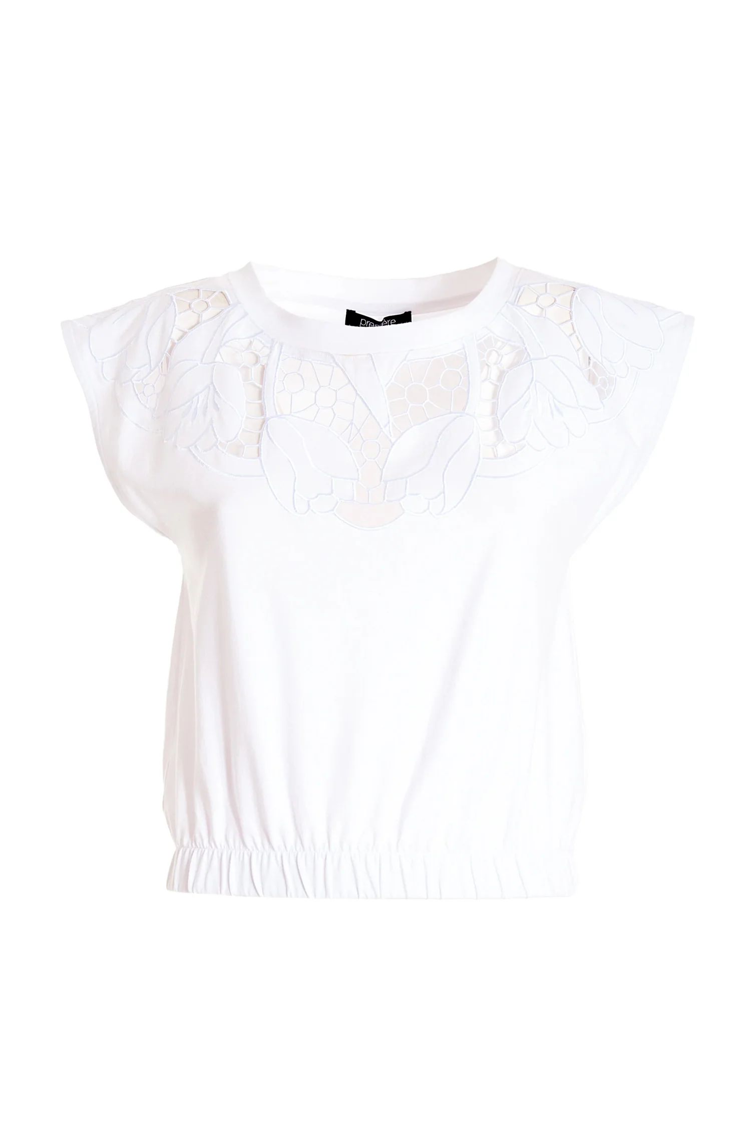 T-shirt senza maniche con trafori, girocollo, e con fondo con elastico.