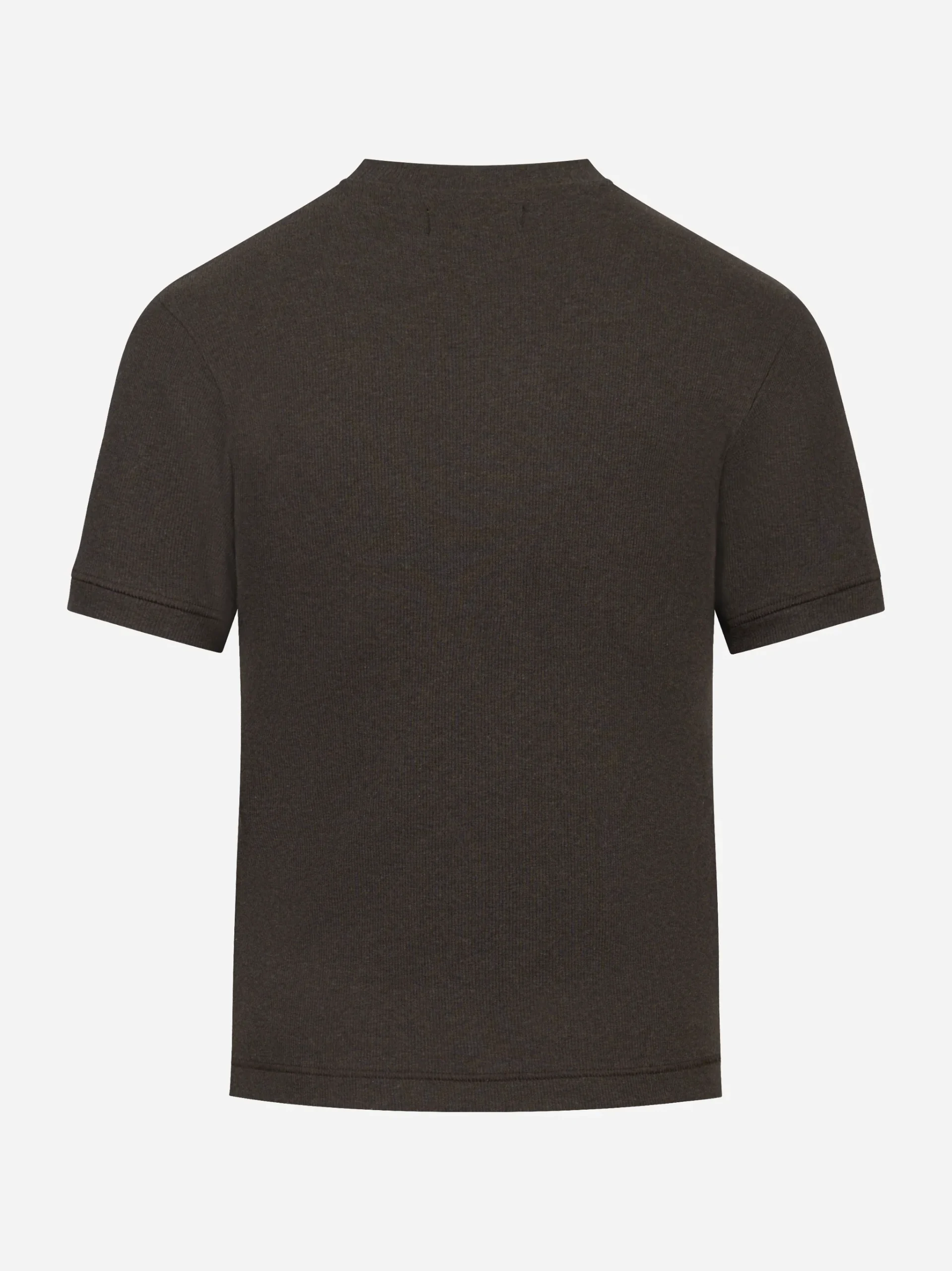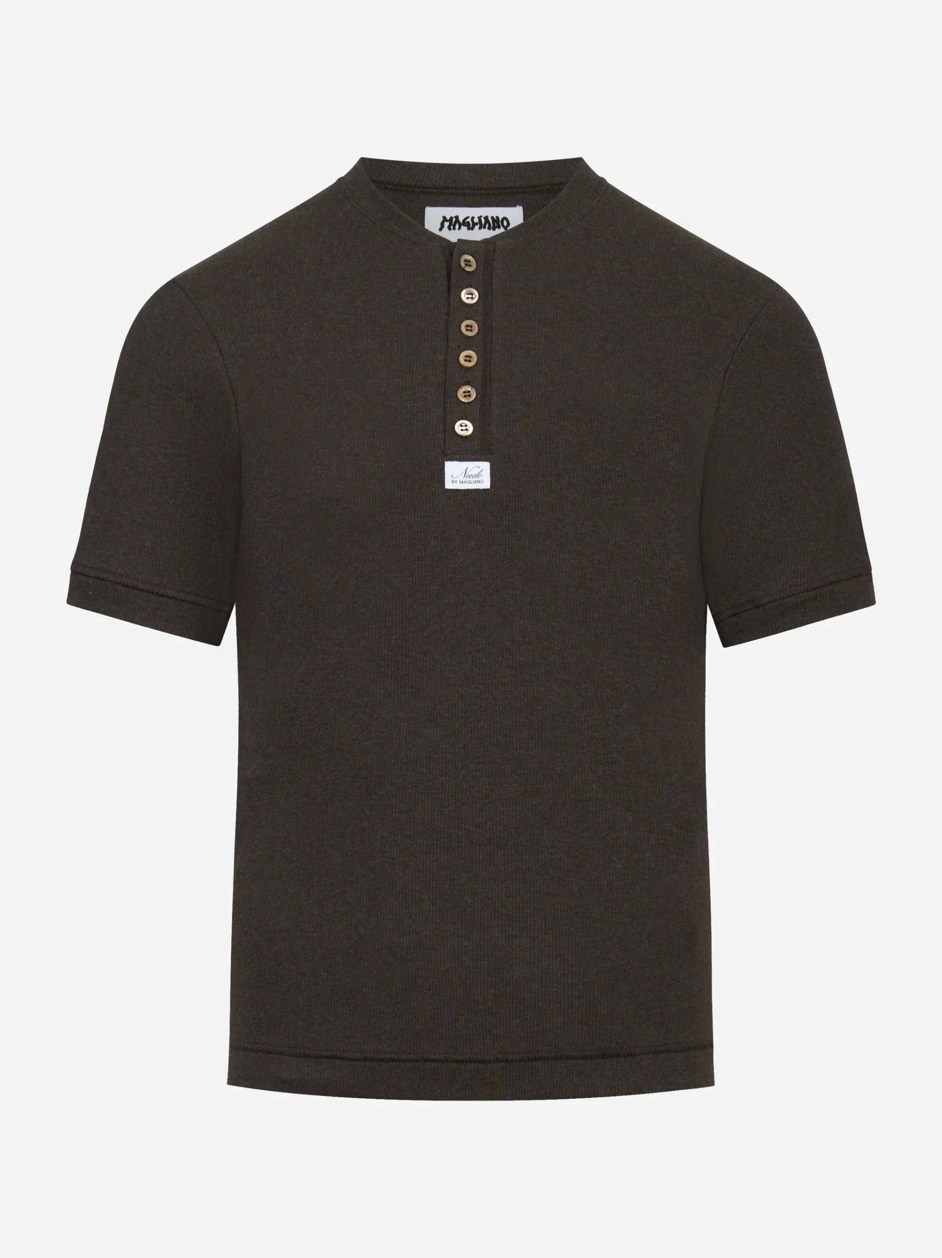 ITEM INFO T-shirt serafino Nudo in cotone stretch marrone Collo serafino Apertura frontale con bottoni Maniche corte Texture a costine Dettaglio etichetta sul davanti Collezione Uomo Primavera Estate 2026 Composizione: 93% Cotone, 7% Elastane Made in Italy