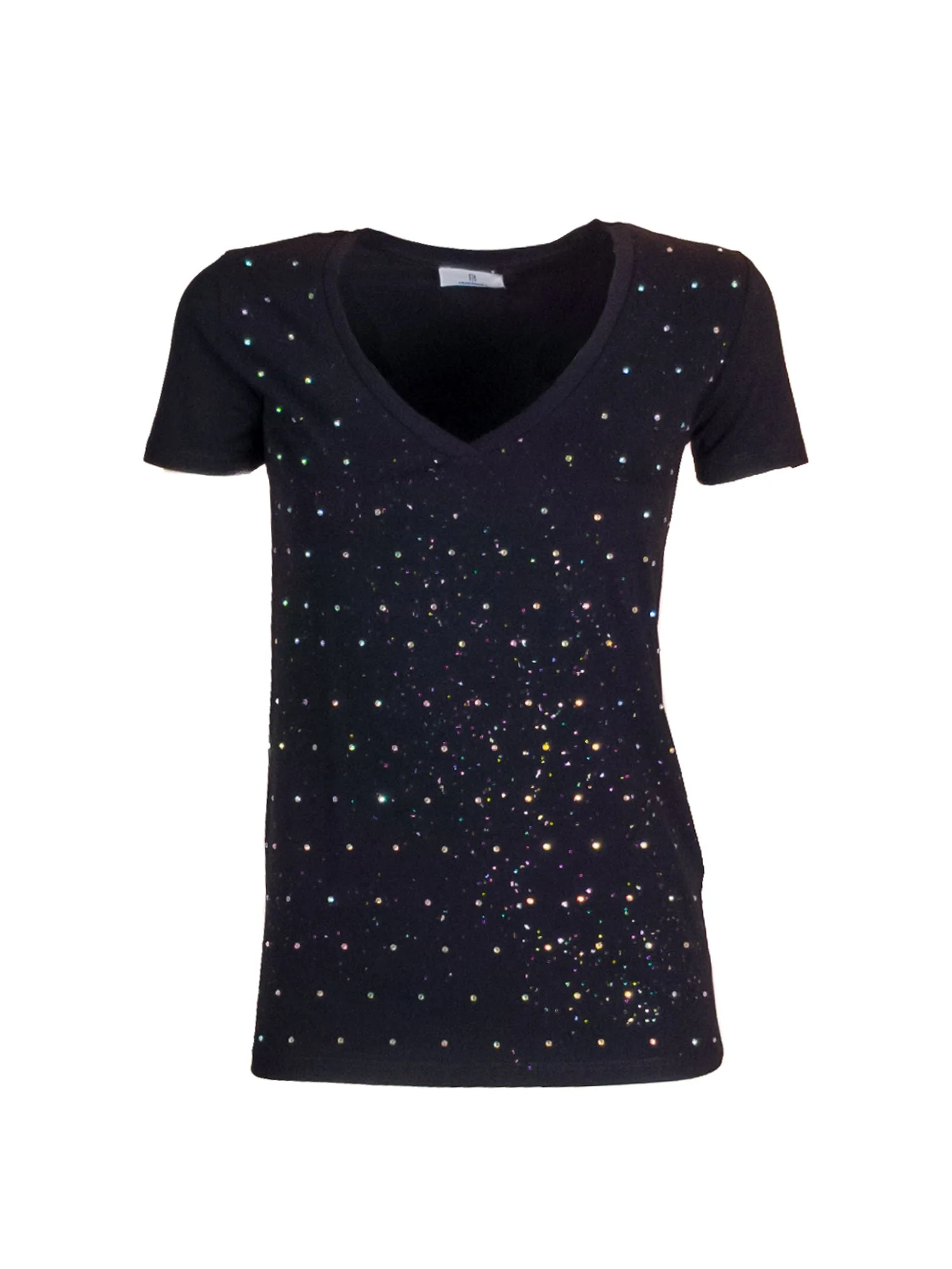 Codice Prodotto: FR25ST3018J401N4-053 Dettagli:T-shirt slim in jersey di cotone strech, scollo a V, glitter, e con maniche corte. • Composition: SHELL: COTTON 96% ELASTANE 4% • Made in: Italy Vestibilità:Slim