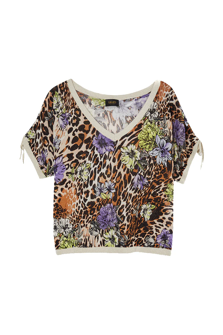 Top in maglia con scollo a V e stampa animalier e fiori