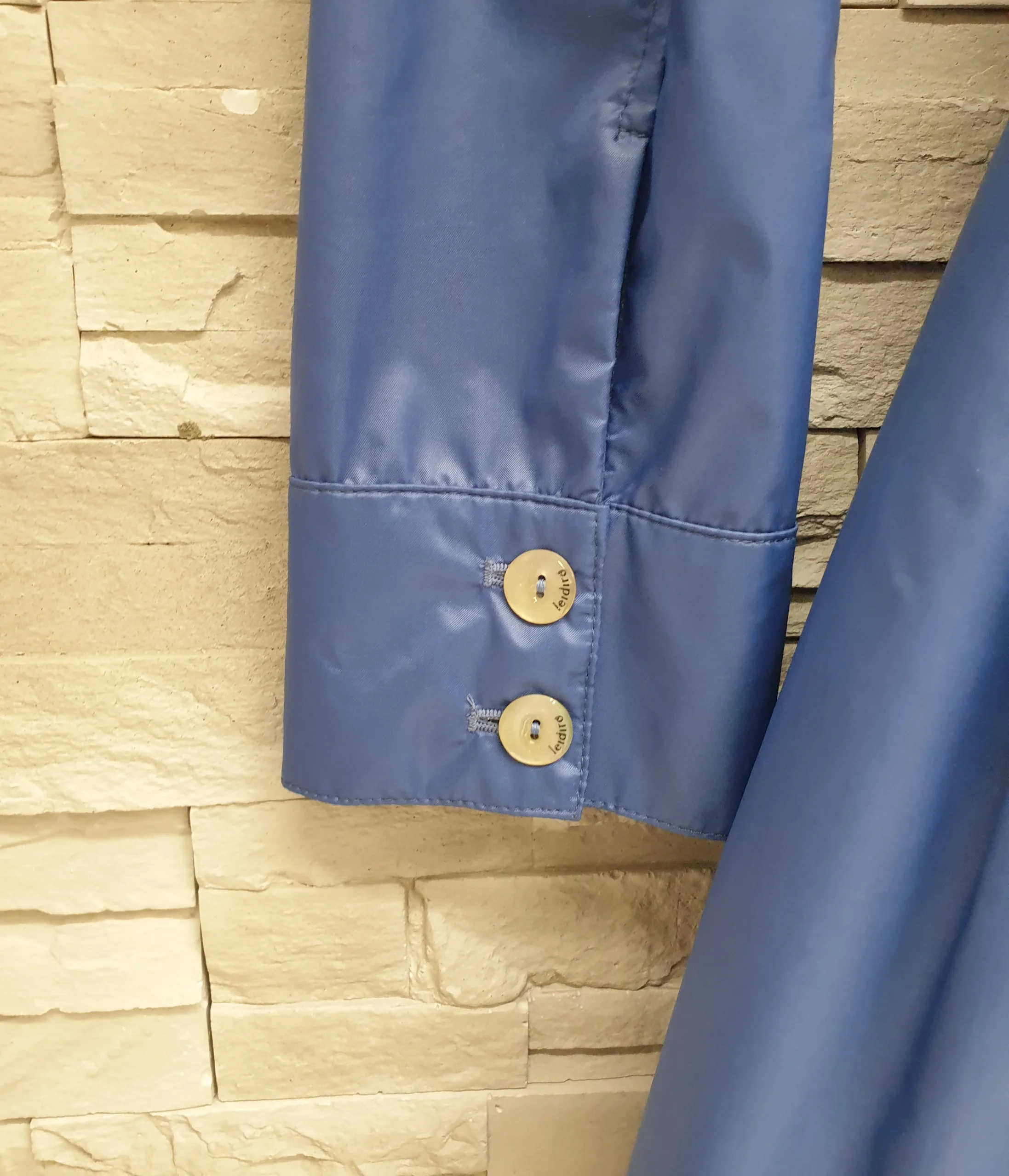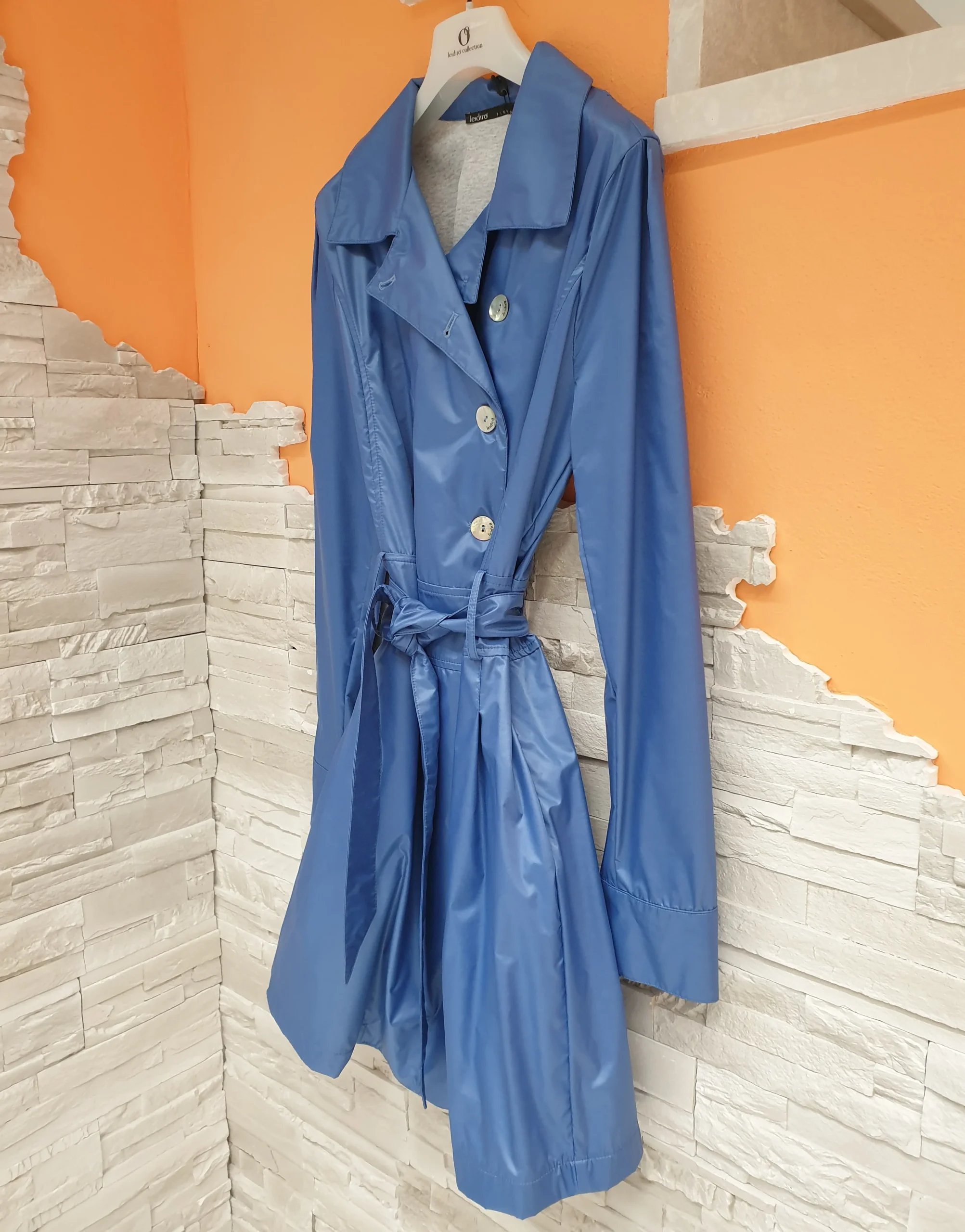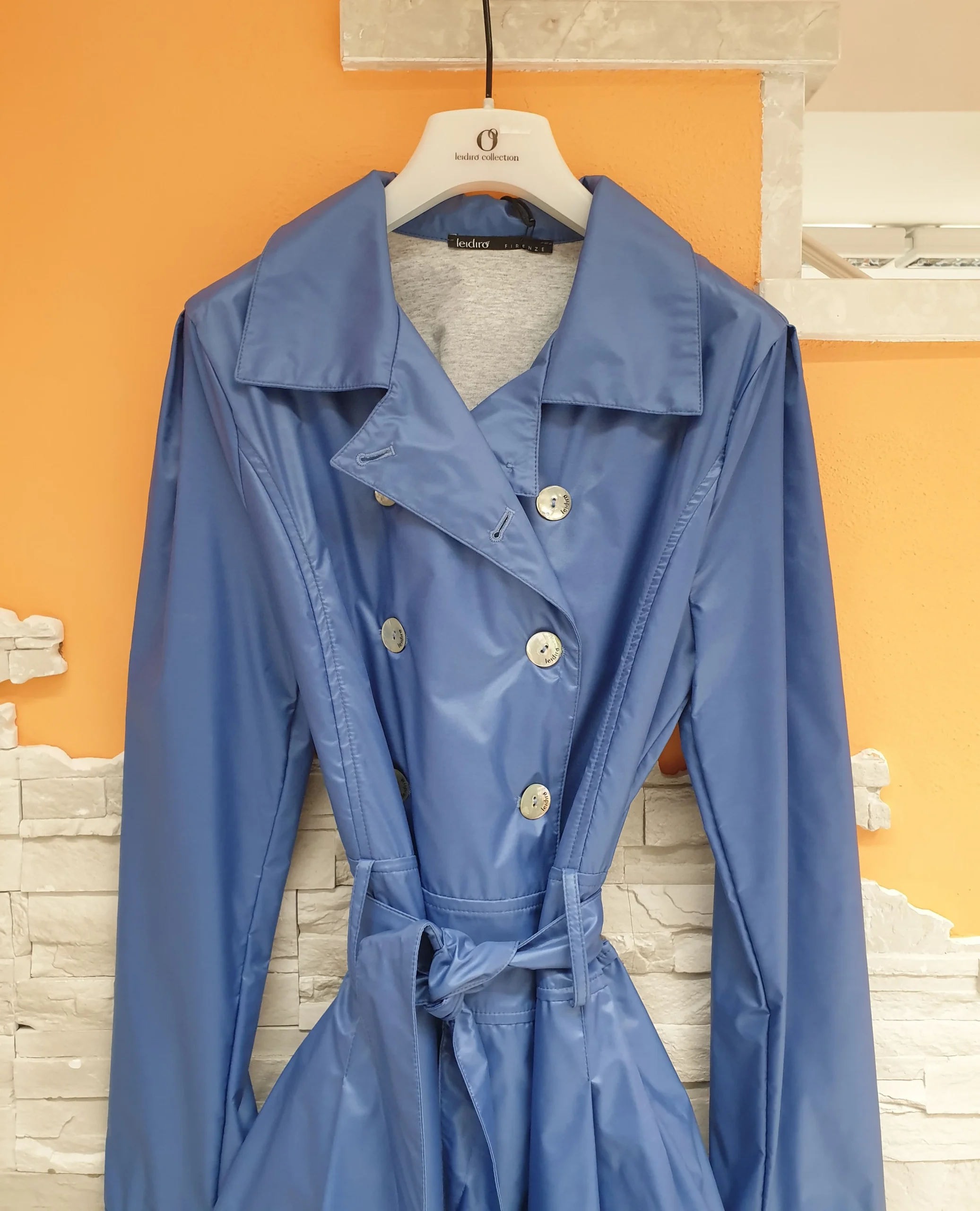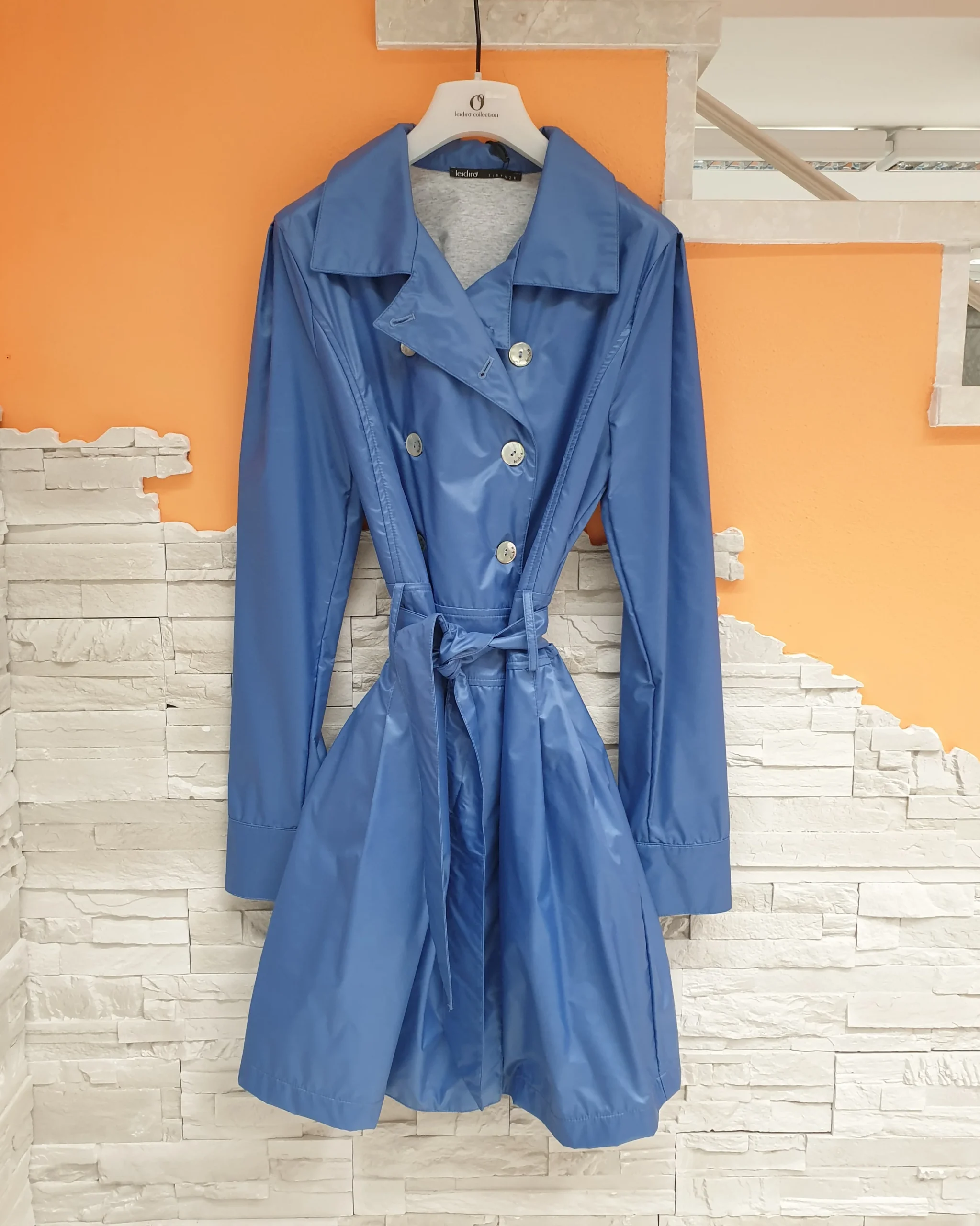 Trench azzurro doppiopetto con cintura in vita. Vestibilità sfiancata, bottoni logati madreperlati, cucitura effetto cintura in vita e pinces sottostanti, tasche laterali. Interno in maglia/felpa melangiata. Composizione: 50% Poliammidica 50% Viscosa MADE IN ITALY