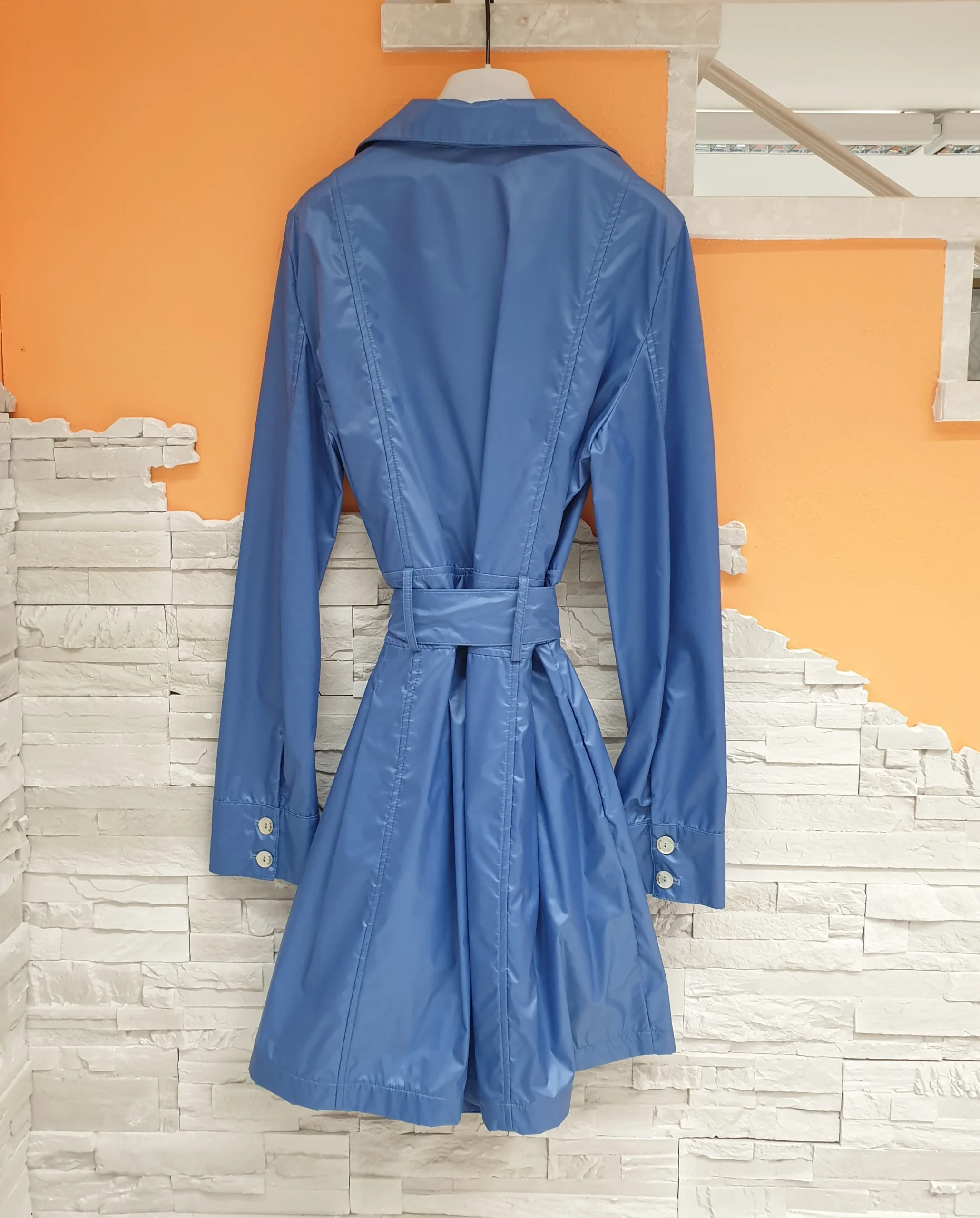 Trench azzurro doppiopetto con cintura in vita. Vestibilità sfiancata, bottoni logati madreperlati, cucitura effetto cintura in vita e pinces sottostanti, tasche laterali. Interno in maglia/felpa melangiata.
