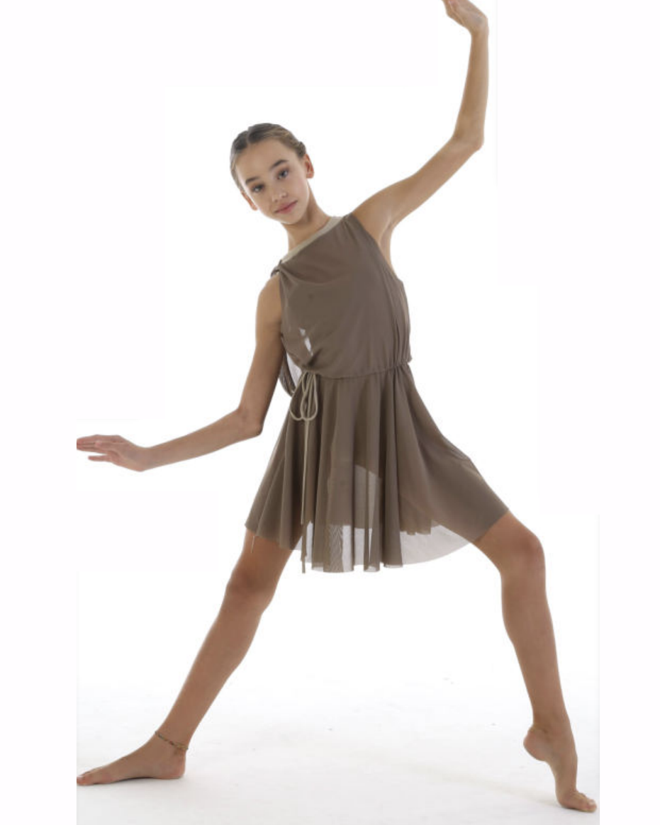 Tunica con scollo a drappeggio sulla schiena, in tessuto velato, coulisse in vita con cordoncino il lycra, gonna a ruota con due spacchi frontali.