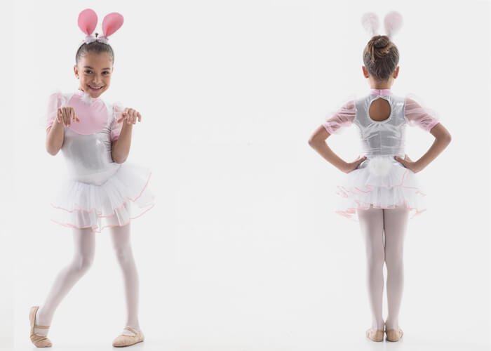 Tutù minù disponibile in taglie bimba, gonna e manichette a palloncino in scintilla. Ideale per mettere in scena coniglietti nel tuo saggio di danza! Un capo realizzato in Italia.