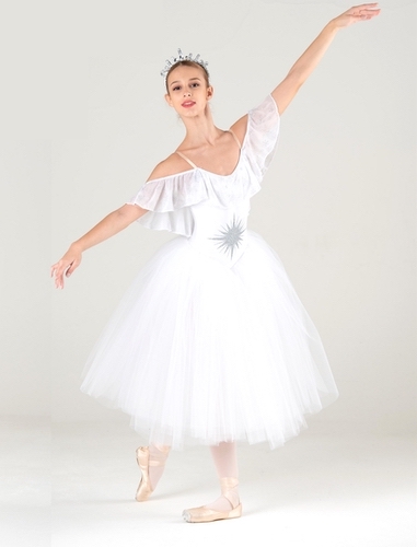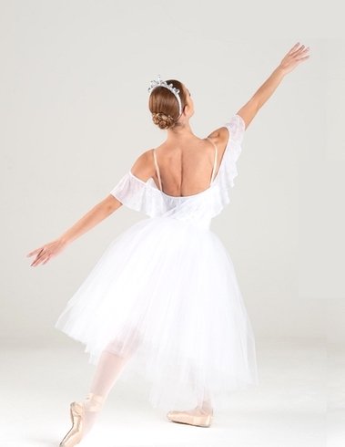 Tutù degas lungo. Body in lycra bianca foderato, volant in retina su tutto lo scollo e spalle. Decoro in glitter argento sul ventre. Gonna realizzata con 6 veli di tulle morbido doppi.