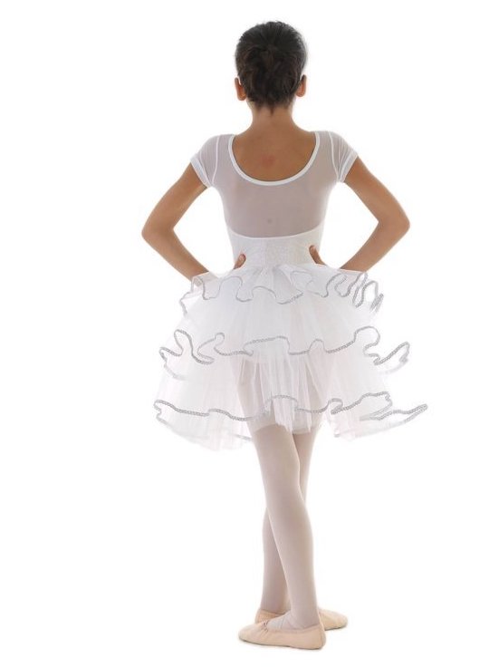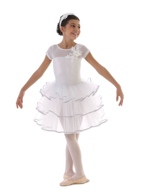 Tutù con body a manichetta in tessuto luminoso e tessuto velato, 3 veli di tulle morbido con passamaneria argento su le tre altezze + 1 doppio, decoro floreale sulla spalla.