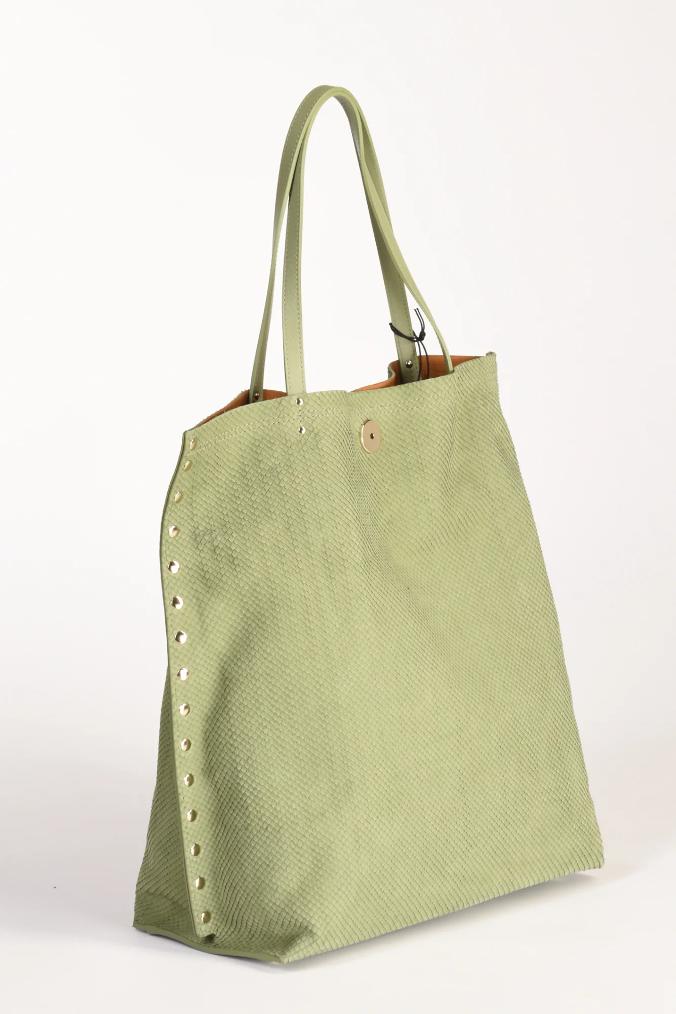 Borsa A Spalla Sfoderata, Fondo Semirigido Con Piedini, Borchie Laterali, Chiusa Da Iconico Girello, Dotata Di Tasca Interna Multiuso Chiusa Da Zip, Parte Frontale Decorata Da Fascietta In Pelle Fissa, Realizzata In Nappa Plonge’ E Lavorata Con Oli Di Lino,composizione 100 Pelle Bovina, Interno 100 Poliestere, Made In Romaniadimensioni 34x39x15luce Manico 21
