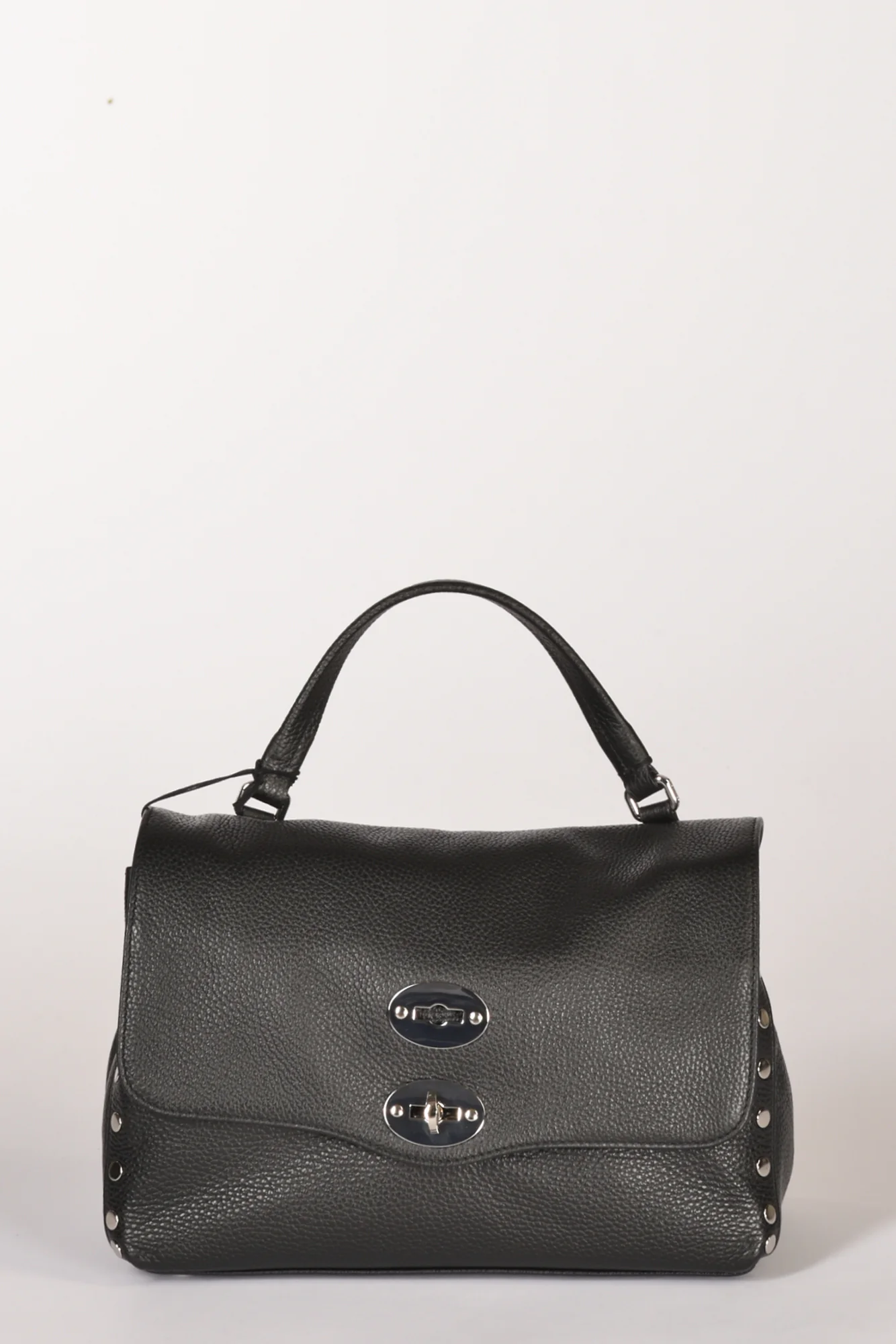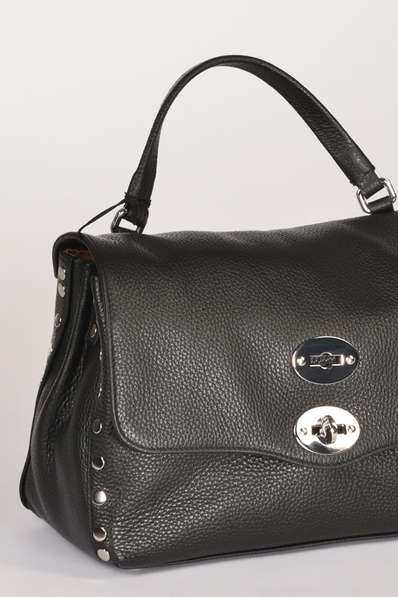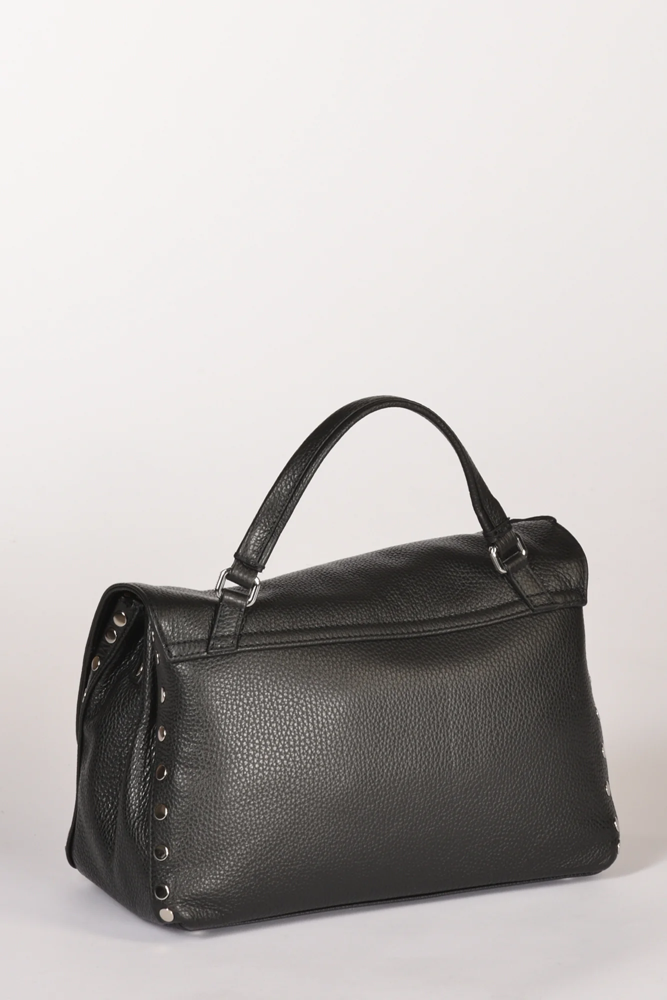 Borsa A Mano Modello Postina, Foderata, Chiusura A Girello Con Patta Battente, Tracolla Regolabile Ed Amovibile, Lavorazione Pelle Martellata, Internamente Presenta Due Tasche Multiuso Di Cui Una Zippata E Due Scomparti, Borchie Metalliche A Vista, Fondo Con Piedini, Composizione 100 Pelle Di Vitello, Made In Italy, Misure Cm 29x20x15, Luce Manico 7